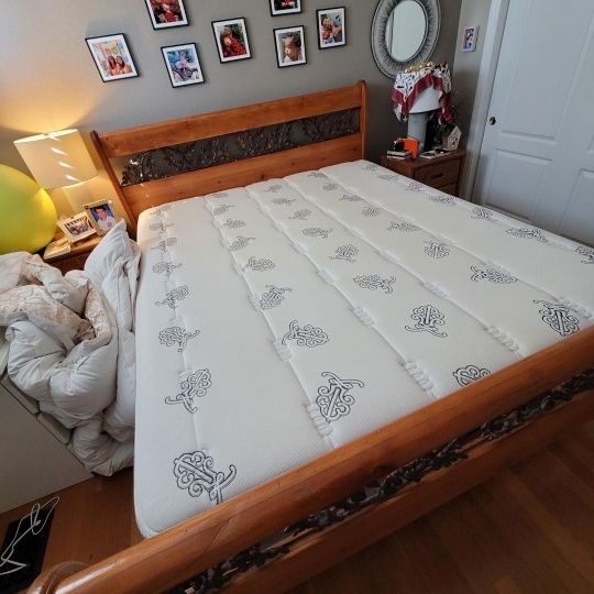 California King sleigh bed with box springs and Beautyrest Black mattress top of the line made of solid oak and wrought iron or best offer. Can be purchased separately. $150 each. Include mattress pad.