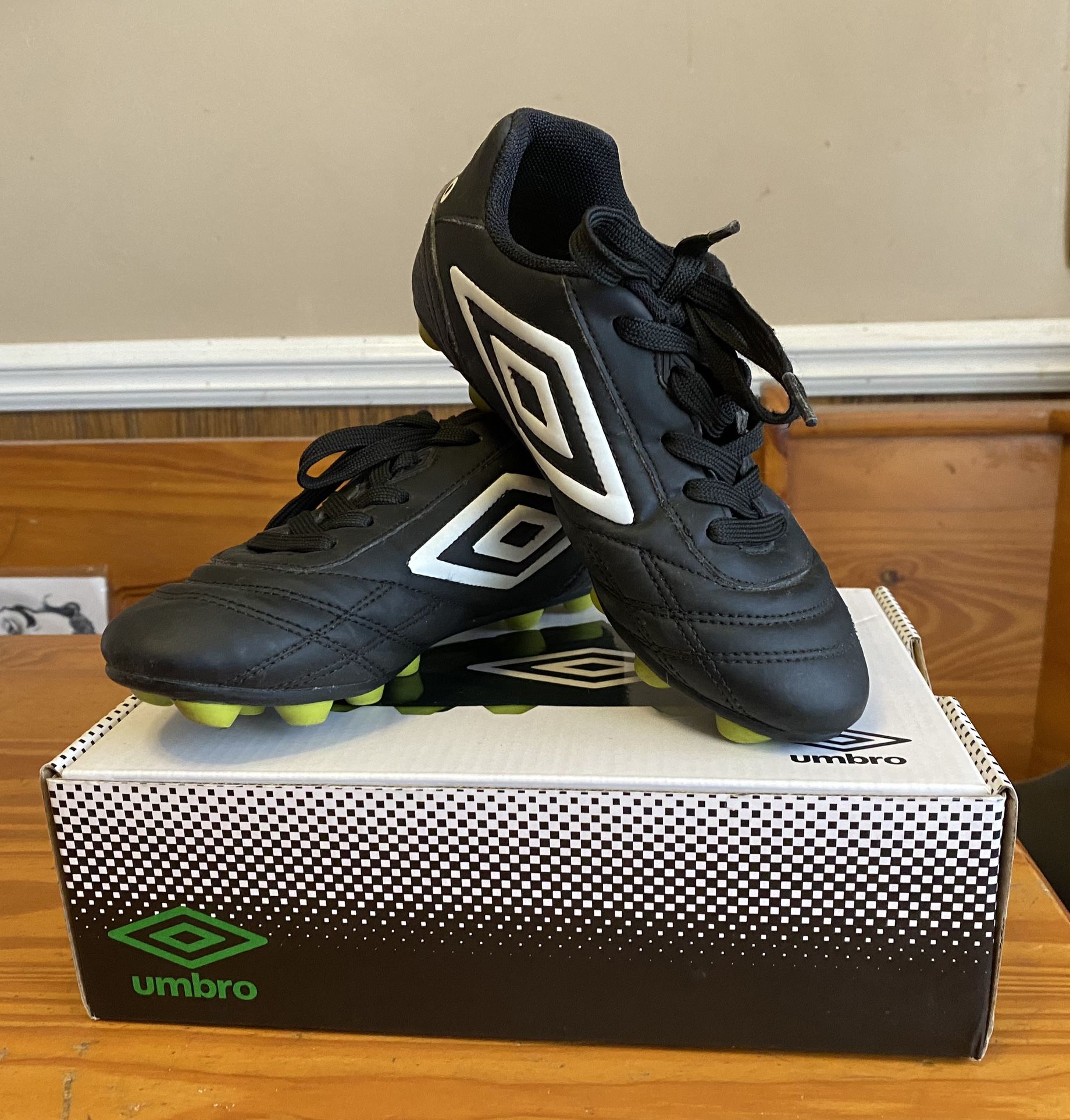 Umbro Finalé black/green cleats for kids. Great condition! We found that laces and leather are able to accommodate a wider foot much better than rubber or boot style cleats. Porch pick-up or contact me to arrange to try them on. $15