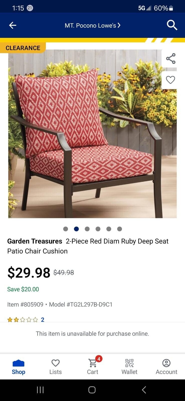 Brand new , never used chair cushions. No longer available in Lowes. $15/each
