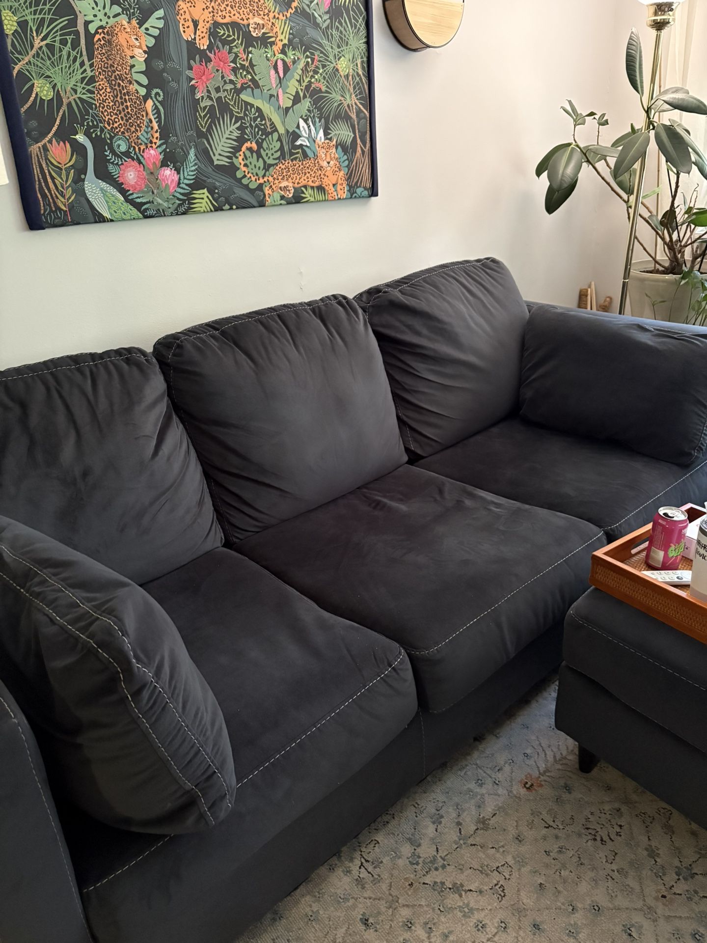 Beautiful and comfortable navy couch! I’ve had it for 2 years and am only selling because I’m moving out of state. Soft and perfect for naps, lounging, watching tv, you name it! This couch has removable seat pillows (helpful for cleaning) and the back pillows are attached. It includes the matching ottoman/foot rest. No major damage. The arm rests are in great shape. No smoking, no pet household, and there are no stains on the fabric. There are very minor imperfections from normal use, but nothing big. The couch dimensions are: 85” width, 39” depth, 36” height. The ottoman is: 33” width, 23” depth, 18” height. You are more than welcome to come visit and sit on it before you buy!