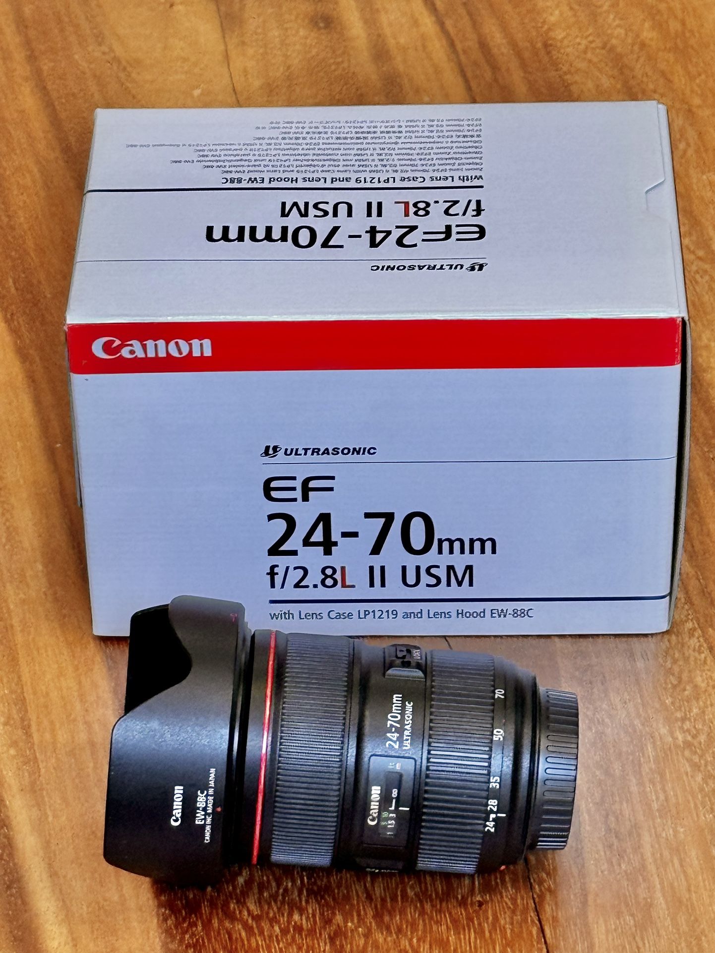 For Sale: Canon EF 24-70mm f/2.8L II USM lens Price: $1,350 - no low offers please I have lenses available also. Here is a list and a photo is attached of them all: • Canon EF 15mm f/2.8 Fisheye - $225 • Canon EF 50mm f/1.4 USM - $275 • Canon EF 100mm f/2.8 Macro IS USM - $700 • Canon EF 16-35mm f/2.8L II USM - $750 • Canon EF 24-70mm f/2.8L II USM - $1,350 • Canon EF 70-200mm f/2.8L II USM - $1,400 • Canon EF 100-400mm f/4.5-5.6L IS USM (Push-Pull) - $1,100 Plus a Canon EOS 5D Mark IV plus battery grip - $1,250