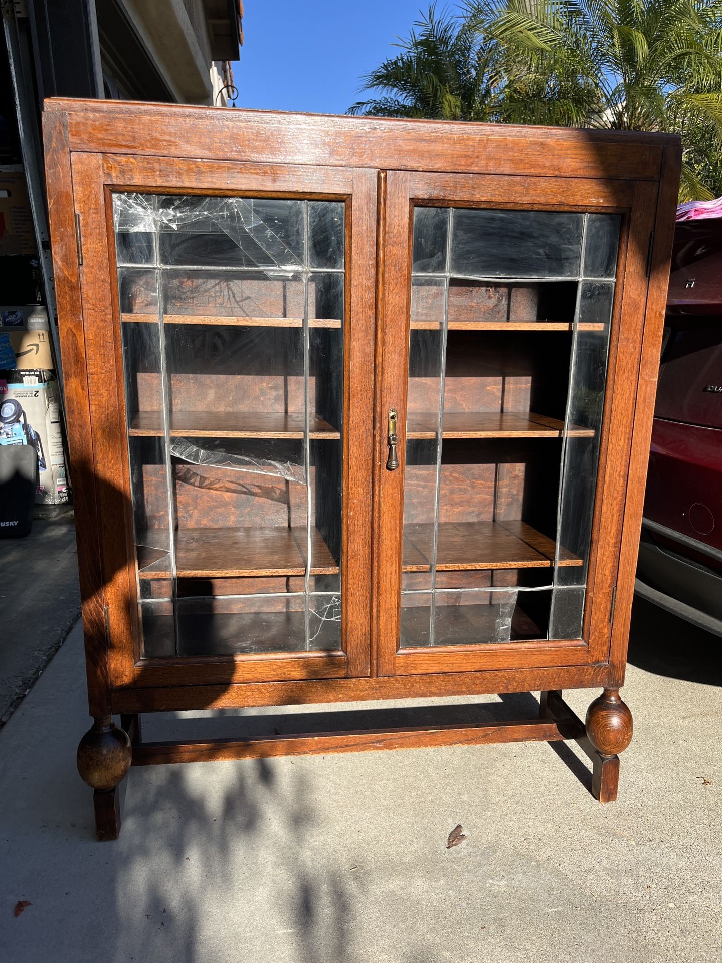 Needs some restoration. Leaded glass on doors needs repaired or replaced and top refinished. Locks work fine and has adjustable shelves. Size: 36” wide, 45” high, 11” deep.