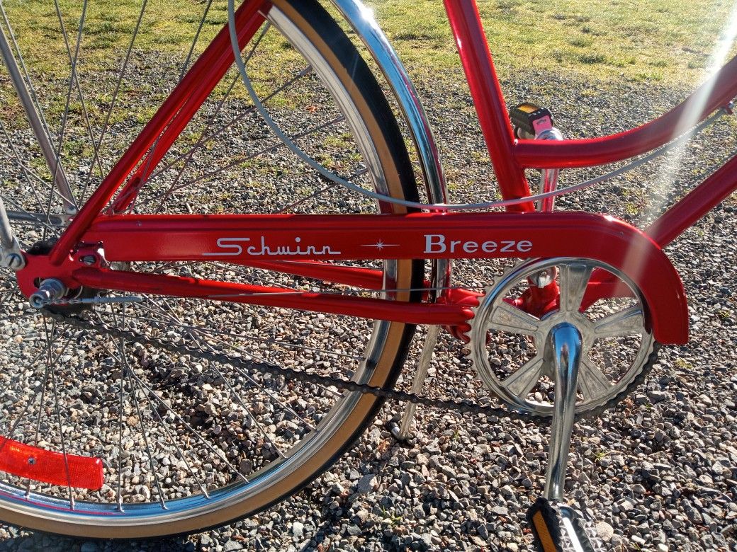 Ready to ride. It's been cleaned, lubed and adjusted. New Kenda gum wall street tires, new rim tape, original tubes. The three speed hub has been taken apart and restored into working condition. The crankcase has been taken apart and lubed. Original brake cables have been lubed and the brakes adjusted. New chain. Polished the full chrome fenders. Most of the decals are in good shape, the seat isn't torn. The odometer is present, but the hardware to run it has been lost.