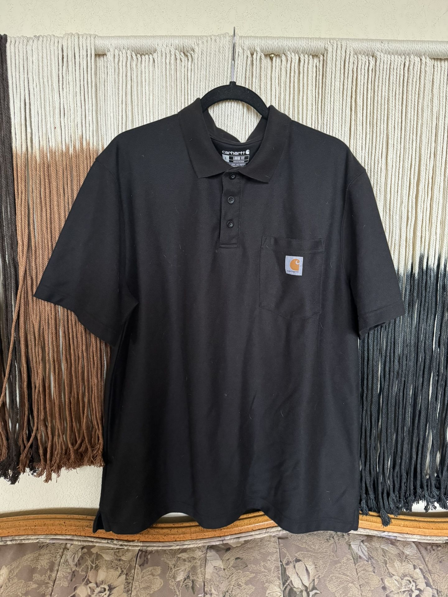 Black loose fit Carhartt polo shirt with a pocket; perfect condition, just has some dog hair that I will lint roll before shipping! Size: men’s large #carhartt #polo #work #loosefit #casual