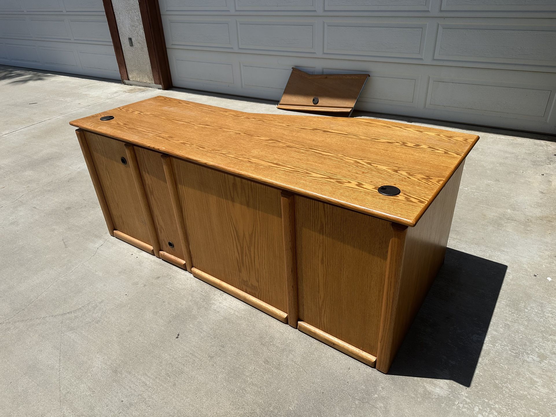 Large oak desk comes apart to move. Lots of drawers and storage. Used. Some wear