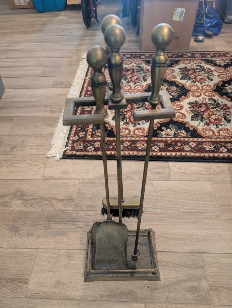 Set of antique brass fireplace tools - poker, shovel, broom.