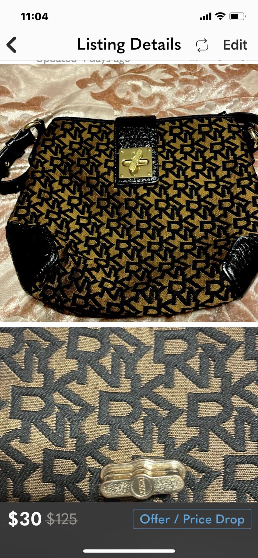 DKNY Crossbody bag chocolate brown with black lettering adjustable shoulder strap good condition. Free gift with purchase.