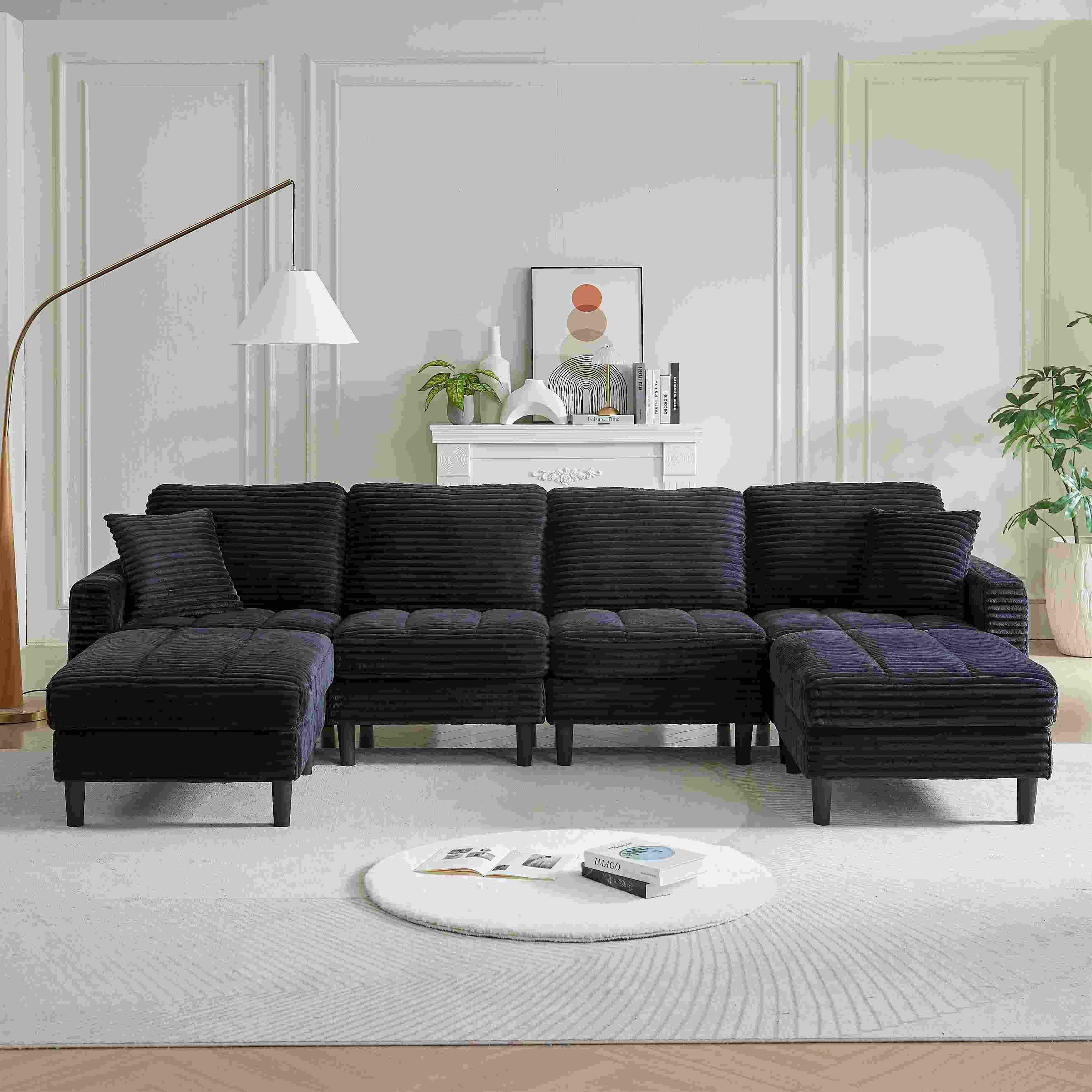 122.5-Inch Oversized U-Shaped Modular Sofa, Corduroy Fabric Sofa, Living Room Sectional Sofa with 2 Pillows, Two ottoman, plastic leg, Black