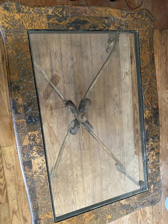 Cocktail / coffee table 48 inches long 33 inches wide 20.5 inches tall Stone top Glass insert Iron bottom