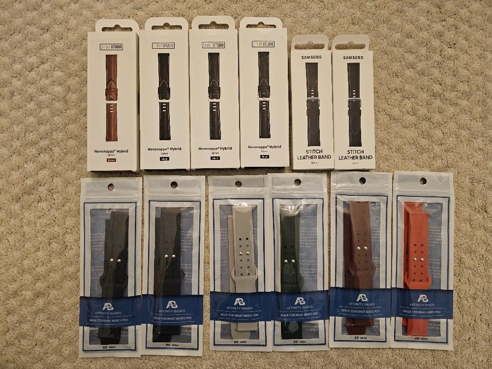 22mm lug leather or sport watch bands. Fits Samsung Galaxy watch, Garmin or Apple watch (with adapter). Or any watch with 22mm lug width. Leather bands: $5 each Black genuine stitch Leather band Black or Brown Novonappa hybrid leather band with rubber back Sport bands: $5 each. Navy, grey, red, maroon color