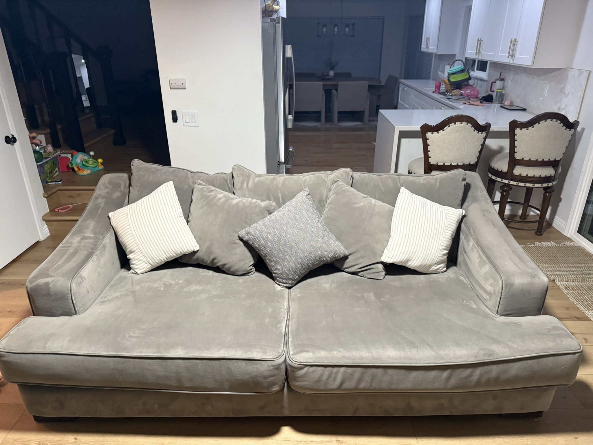 couch and loveseat set in a charcoal gray. I am the first owner and have had the couches for five years. They have been in our pet free and smoke free home. Does not come with white pillows.