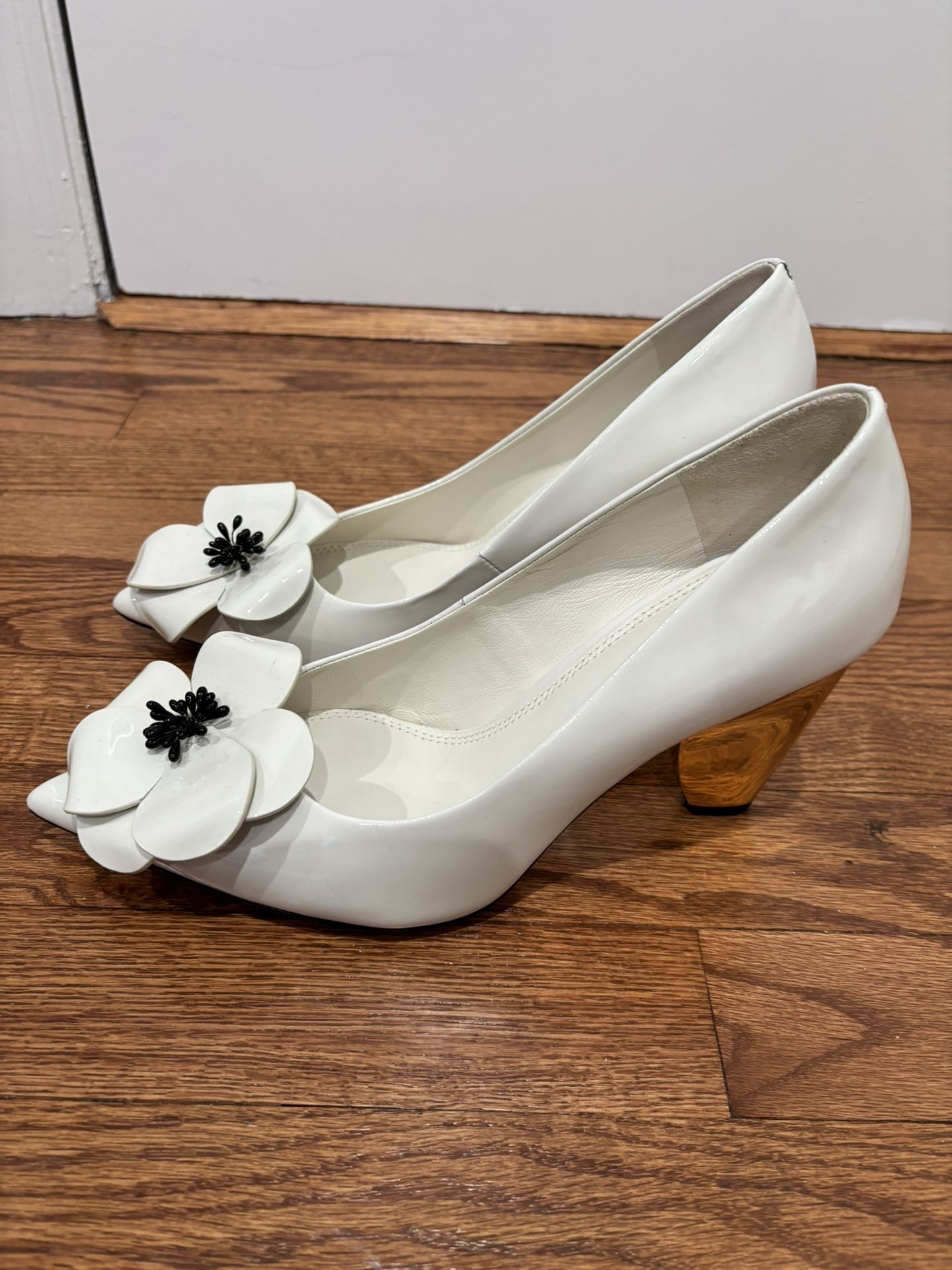 Tory Burch heels limited edition. Size 8.5. In good condition. They have a small black line on the side. Please see picture 3.