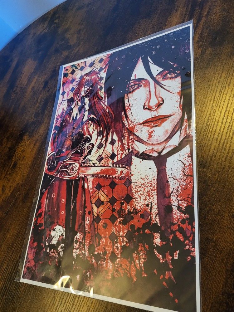 11"×17" print featuring fan art of Black Butler characters Sebastian Michaelis and Grell Sutcliff. The print falls under the theme of art, making it a unique and eye-catching piece for fans of the series. Perfect for adding a touch of personality and style to any room or collection. Artist signed