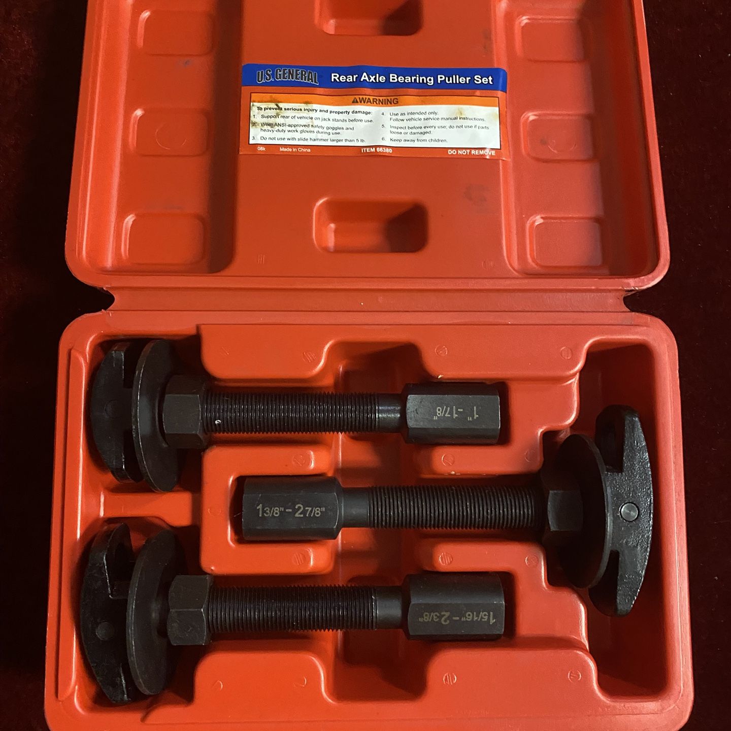 Tools are in Like new condition APPLICATION]: This rear axle bearing puller can help to pull out semi-floating rear axle bearings quickly and effectively. • [EASY TO USE]: The washer of the axle bearing puller can captures the bearing firmly to distribute the force to the whole bearing, can avoid damage of the bearings and case. • [DURABLE MATERIAL]: The rear axle bearing removal tool is constructed from heavy duty cast steel, which has good strength and durability, can provide long service life. • [SIZE]: The bearing puller remover set includes fittings for main bearing tube: Small: 1" to 1-7/8", Medium: 1-5/16" to 2-3/8", Large: 1-3/8" to 2-7/8". • [PACKAGE]: It comes with a plastic carry case, for easy transportation, safe storage, and quick organization.