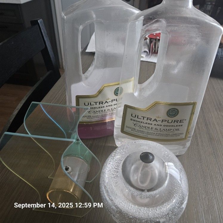 Two clear glass, lamp oil candles. Beautiful when lit. I no longer have a use for them anymore. It's someone else's turn to enjoy.