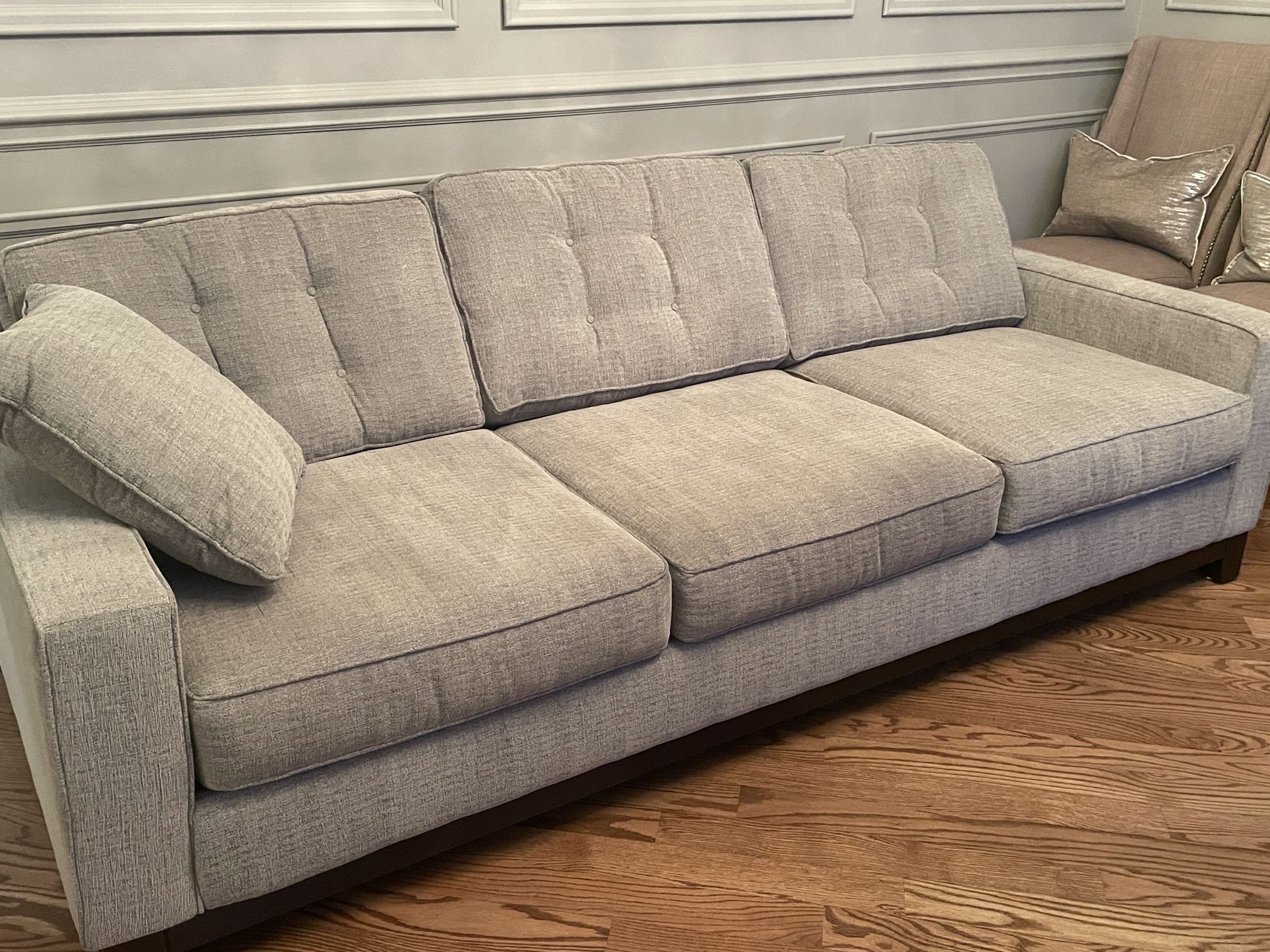 Really nice couch. Grey color. 2 years old. We moved. Perfect condition. No pets. No smoking. No stains. 92in long by 37in deep by 29in high.