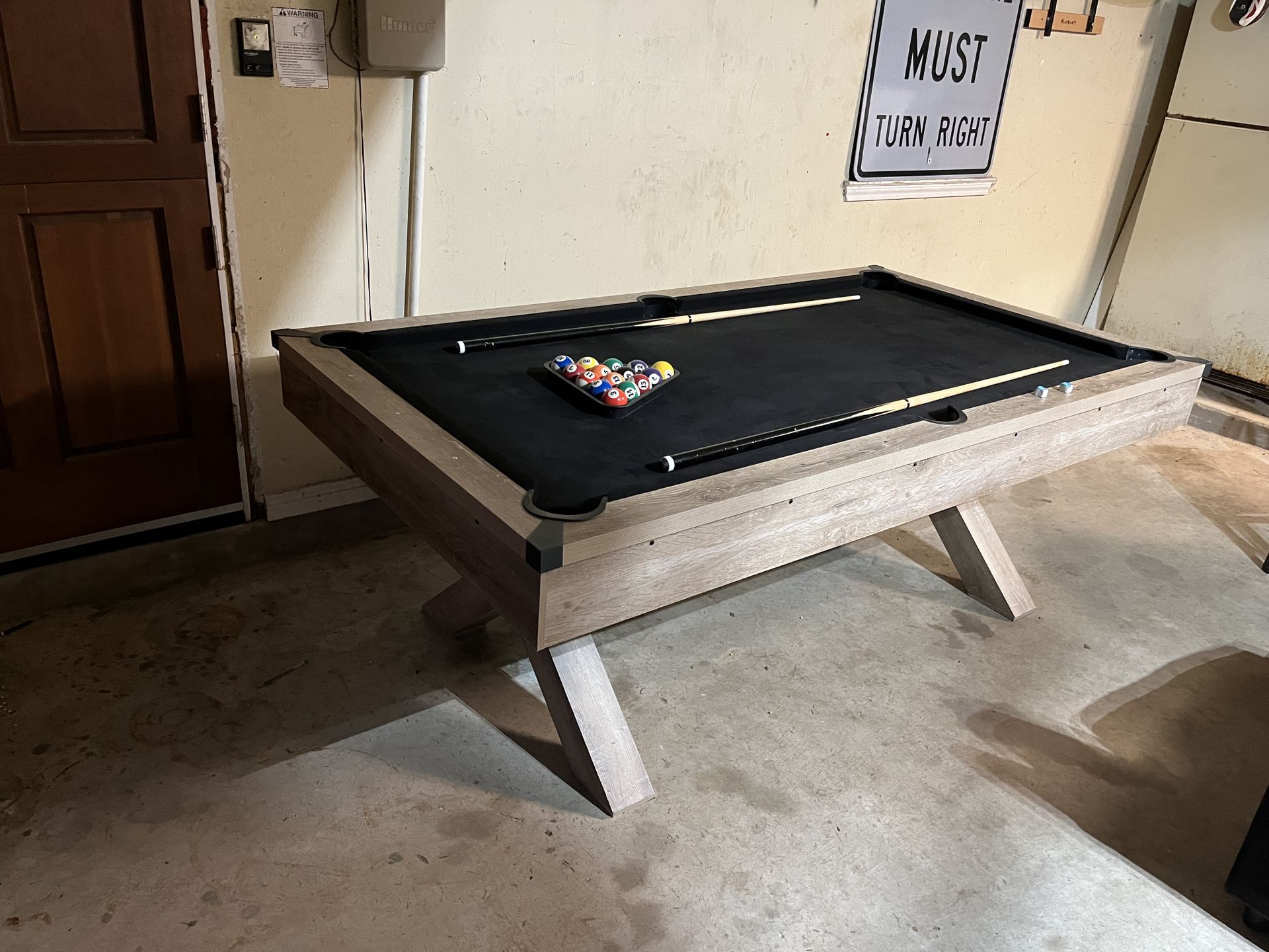 • Elegant 7-ft billiard table with a sleek, modern design • Crafted from durable HDF and solid wood for long-lasting use • Sturdy X-leg frame provides excellent stability during play • Spacious playing surface—great for practice or casual games • Includes 2 cue sticks, full ball set, rack, and cleaning brush • Ideal for game rooms, man caves, or family entertainment spaces • Clean, well-maintained look that elevates any room • Ready to use Will deliver for free within 20 miles.