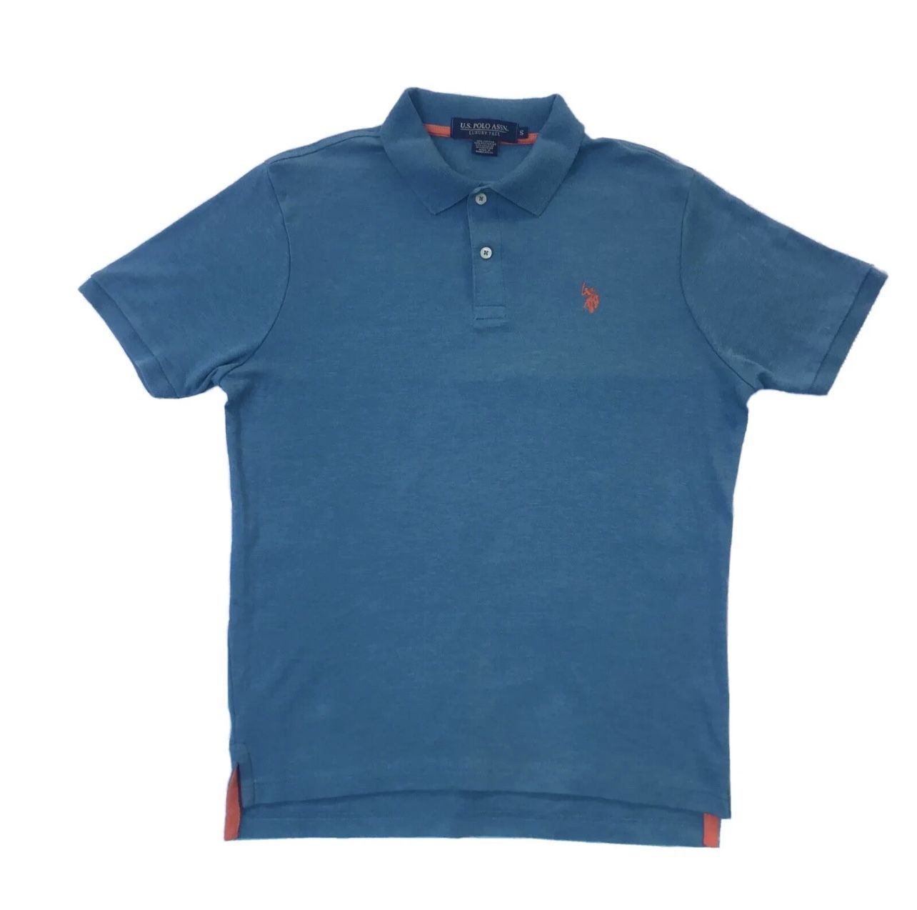 US. Polo Assn. Luxury Feel Mens Collar Buttons Down Short Sleeve Shirt Azure Blue Color Small Size. The U.S. Polo Assn. polo shirt described as follows: Brand and Type: U.S. Polo Assn. Men's Polo Shirt. Color: Azure Blue. Material and Feel: Crafted from a breathable and lightweight fabric, potentially interlock material, designed for comfort and a soft, luxurious feel against the skin. Features: • Short sleeves. • Collared neckline with a button placket. • Embroidered U.S. Polo Assn. logo, likely a multicolor pony, on the chest. • Contrasting orange trim visible on the inner collar and side slits at the hem. Style and Versatility: Designed for a pulled-together casual look, suitable for warm weather or various casual and smart-casual settings, pairing well with jeans, shorts, or chinos. Machine Wash Cold with like colors only 60% Cotton/40% Polyester Made in Bangladesh Measurements Chest: 38” inches (around body measuring) Sleeve: 8” inches Shoulder to neckline: 5” inches Shoulder to shoulder: 16” inches Front shirt length is 26” inches Back shirt length is 28” inches Pre-own in good condition, like new!