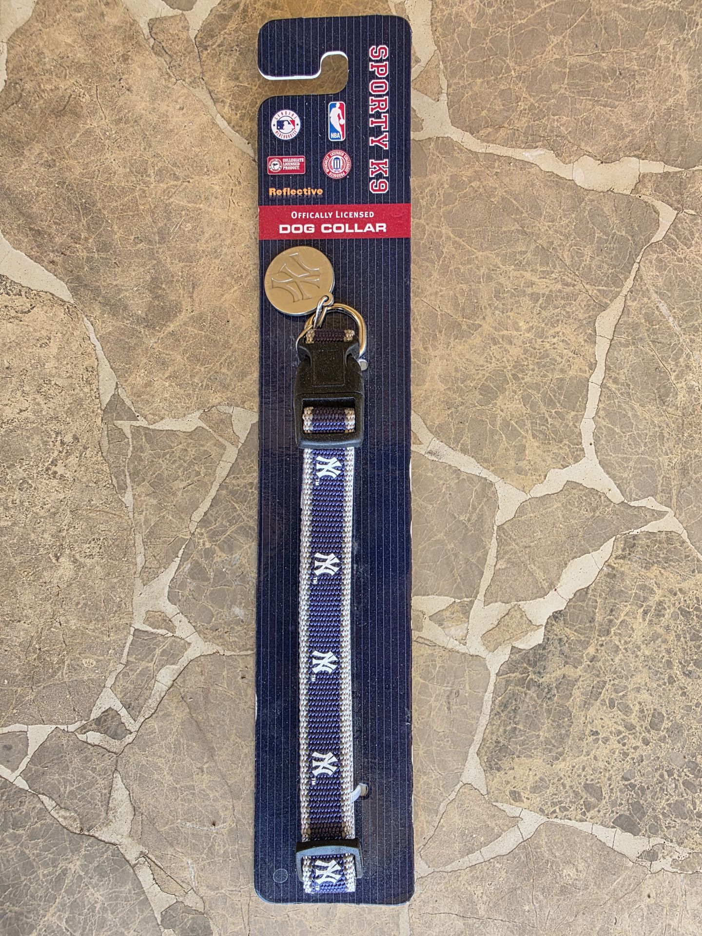 This is a brand new dog collar with the New York Yankees Logos on it. It's never been used. Reflective for nighttime use with a NY Yankee tag. Size 10"-28" neck For small and medium sized dogs