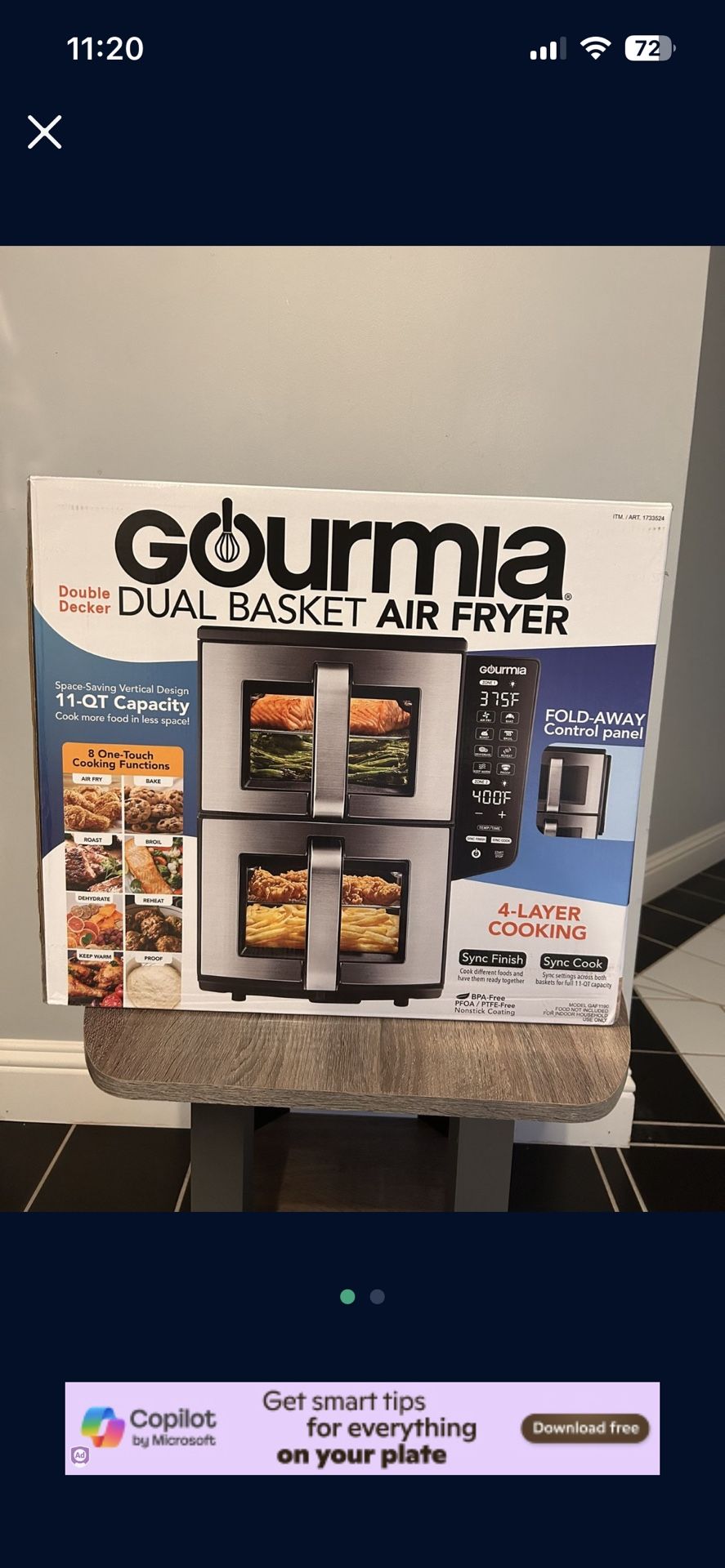 Gourmia DUAL BASKET AIR FRYER- 11-qt with finishing technology. New in box. Never used.