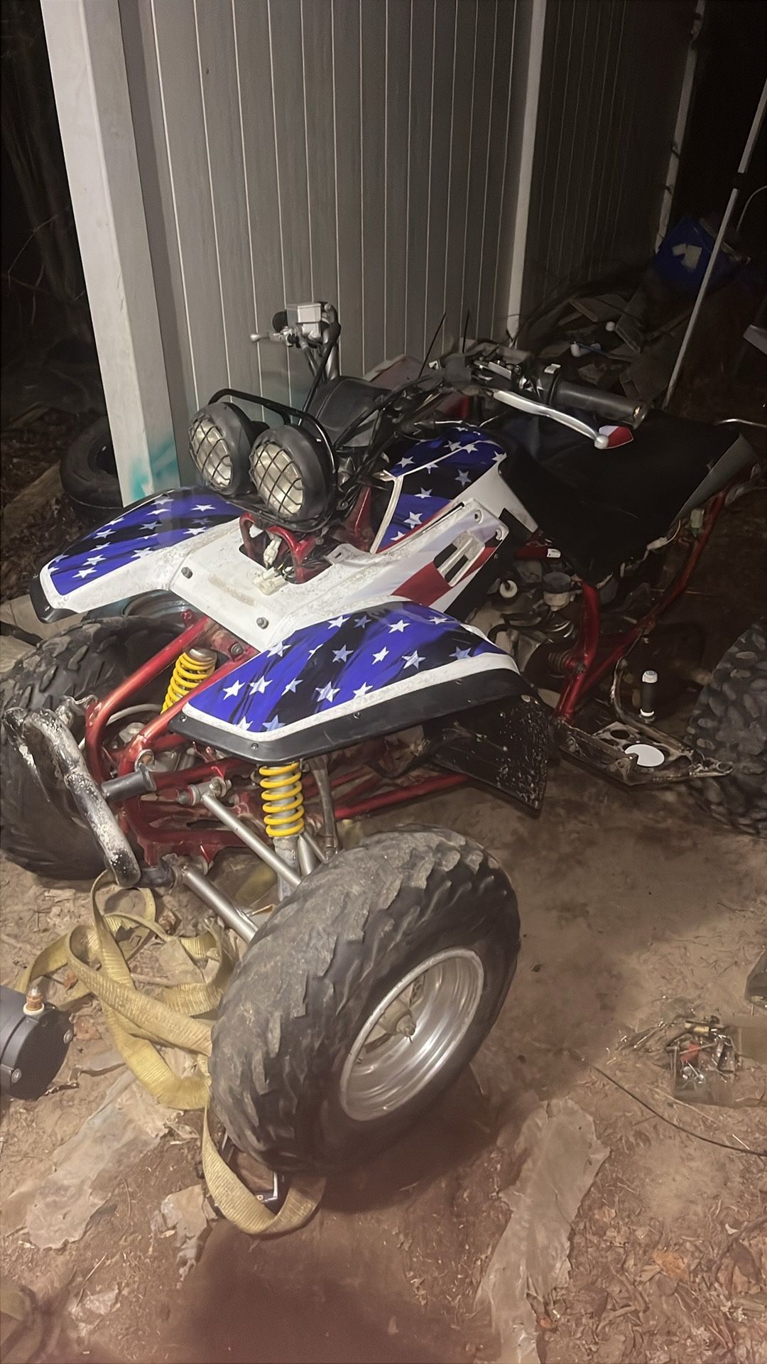 Runs rides Needs carb replaced keeps leaking fuel Tires need replacing but will hold air for a day Comes with the back plastic new wiring harness computer cdi box coil pack 2 seats 2 gas tanks