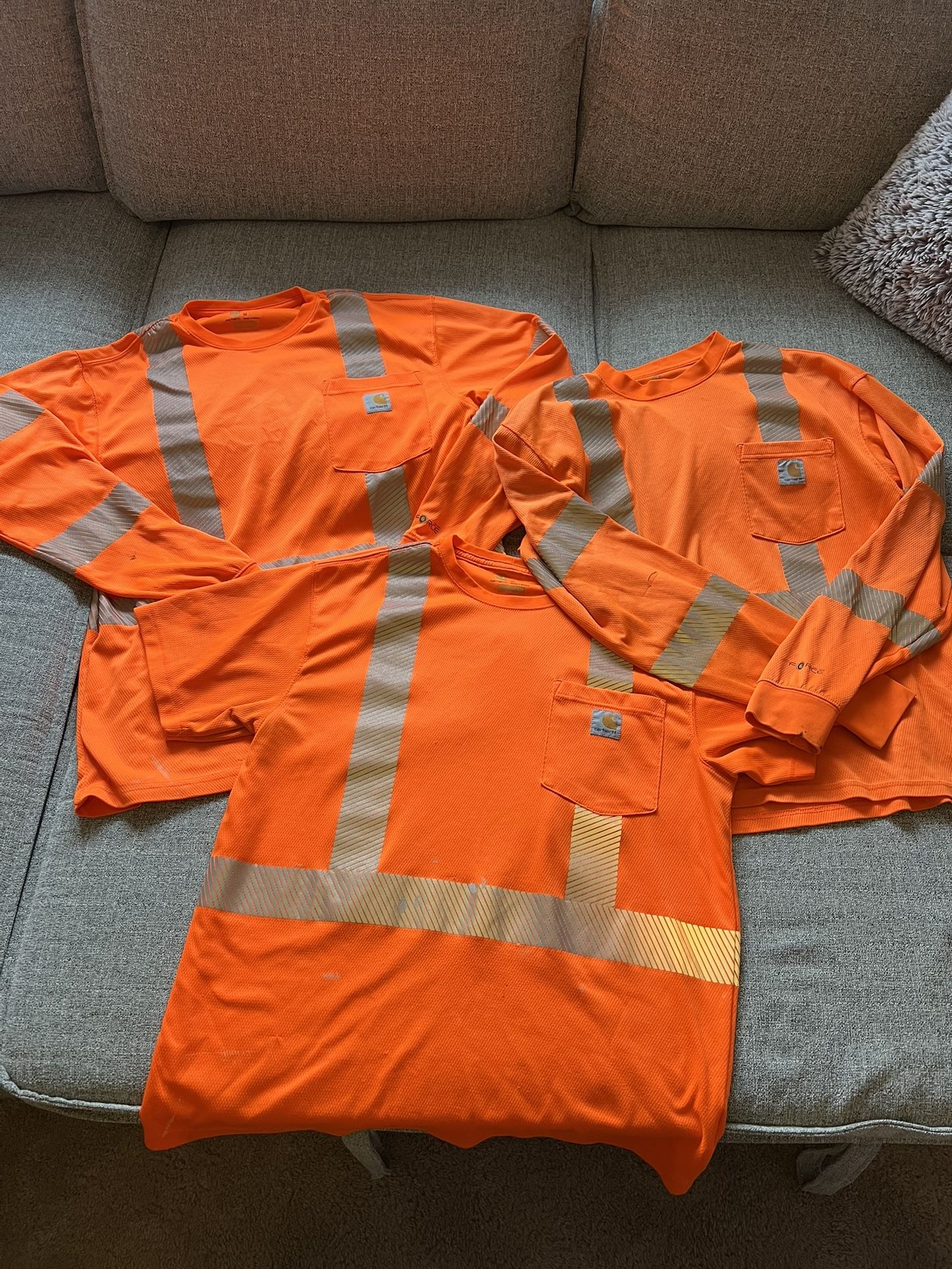Selling three, lightly used Carhartt Class 3 High Visibility Shirts, two long sleeve, one short sleeve. All size medium, relaxed fit. They’re in good shape, they just don’t fit anymore. $10 for all three, thanks!