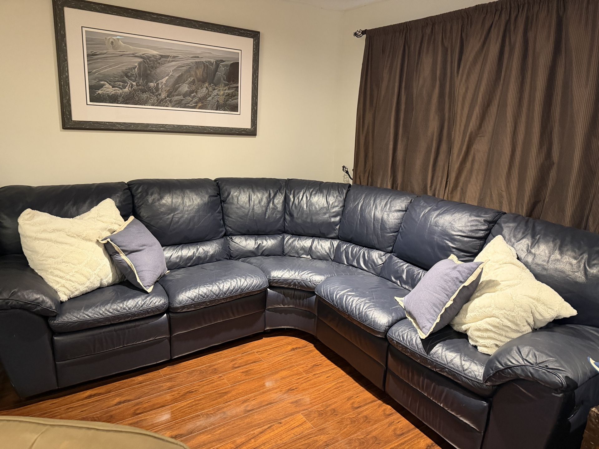 3-piece sectional navy leather couch in excellent condition. Fully functional recliners at either end of couch. Looking for someone to buy and pick asap. L shaped dimensions: both sides are each 8 feet, width 3 feet.