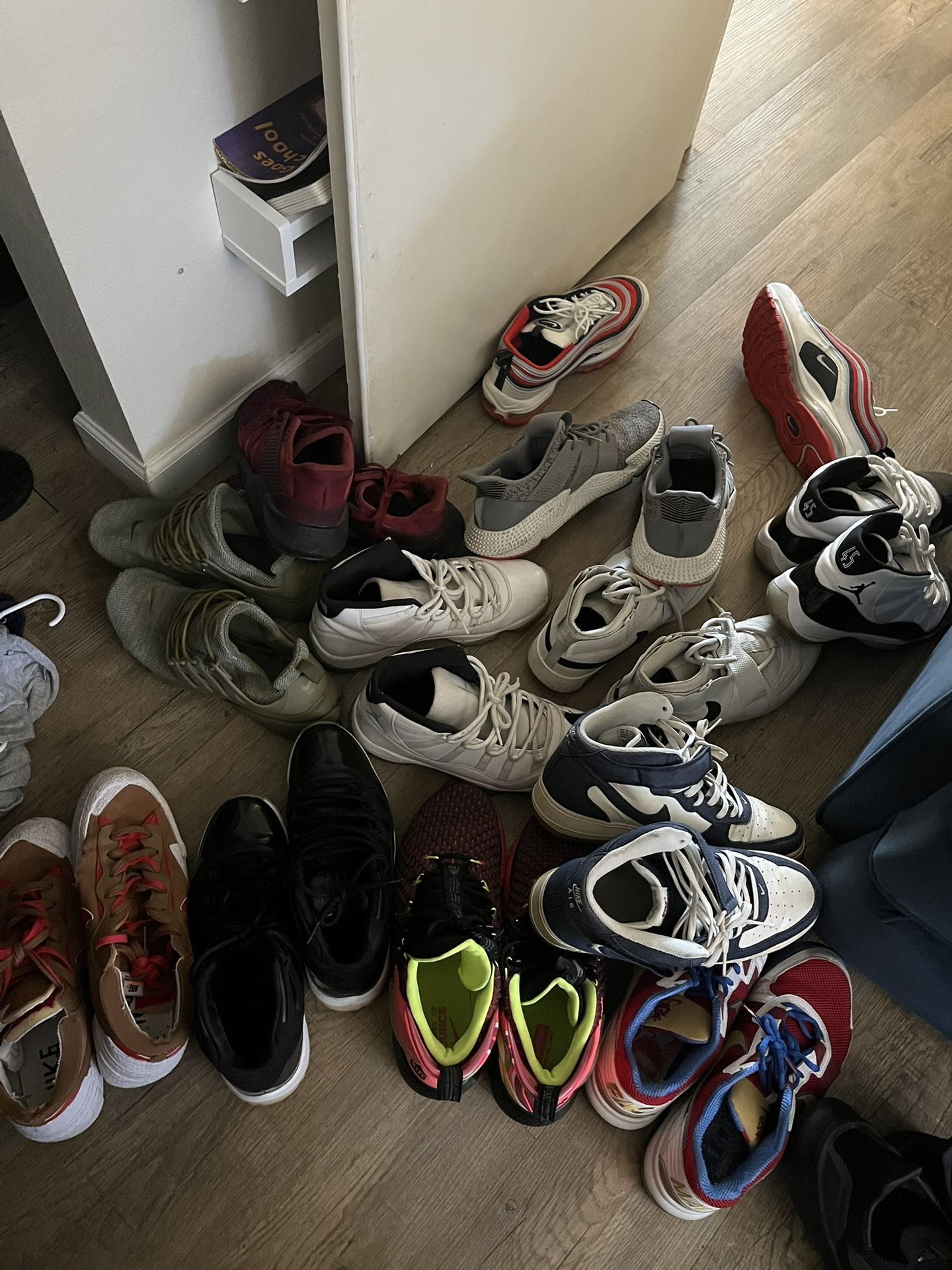 12 used pairs of size 12 shoes. Air max Adidas Sacais 3 pairs of Jordan 11s LOB Nikes Manny paquiao trainers prestos Air Force ones All together only. Will not Seperate the pairs.