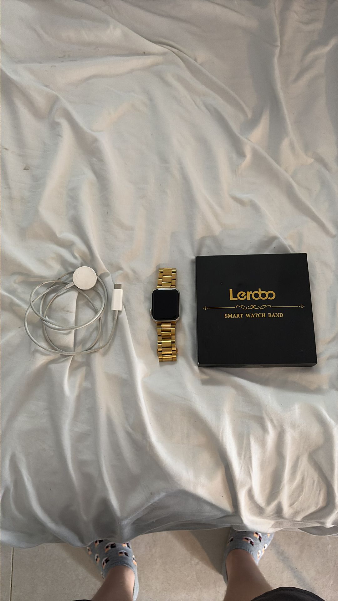 Works great, hardly used. Comes with gold and black band and charger.