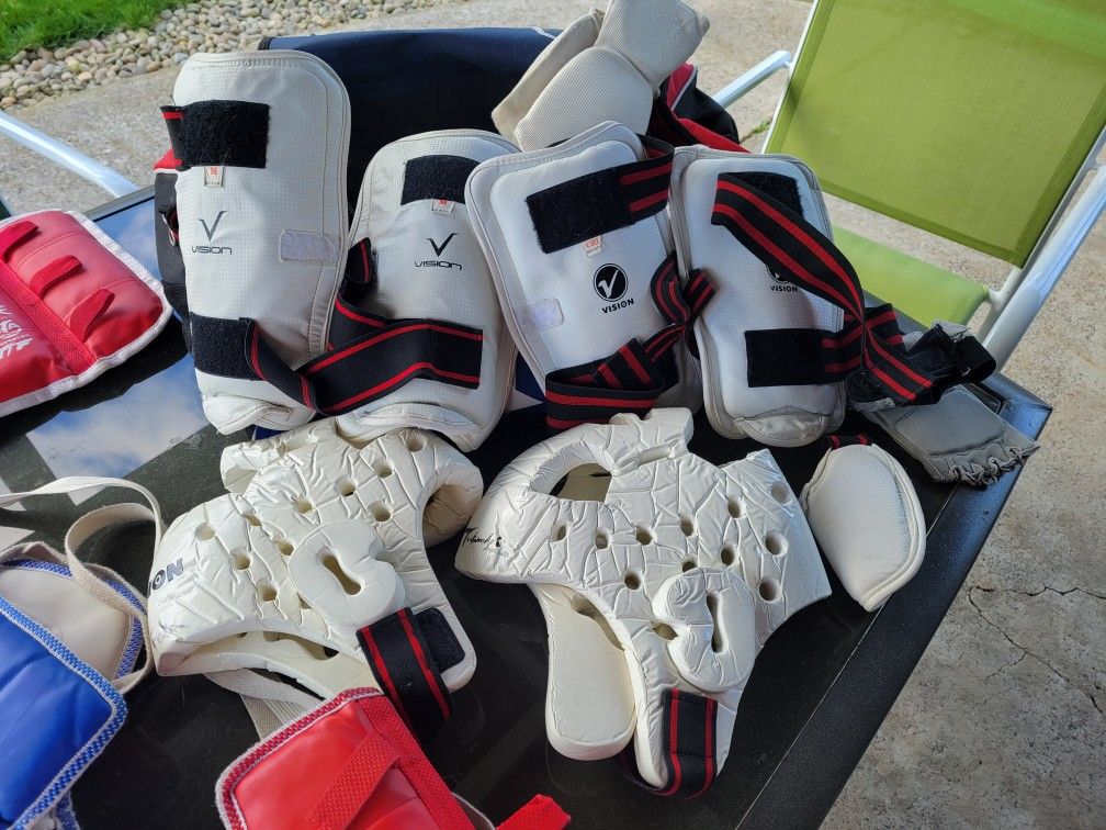 1 size 2 chest pad 2 size 3 chest pads Chin pads Head gear Duffle bad