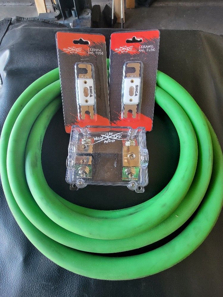 10 FEET OF 2/0 OFC POWER WIRE, 2 WAY ANL FUSE HOLDER AND 2 150 AMP CERAMIC FUSES. 0 GAUGE INPUT, 2 4 GAUGE OUTPUTS FOR FUSE HOLDER. CHECK OUT MY POSTS FOR OTHER AUDIO COMPONENTS AND ACCESORIES. INSTALLATION ALSO AVAILABLE