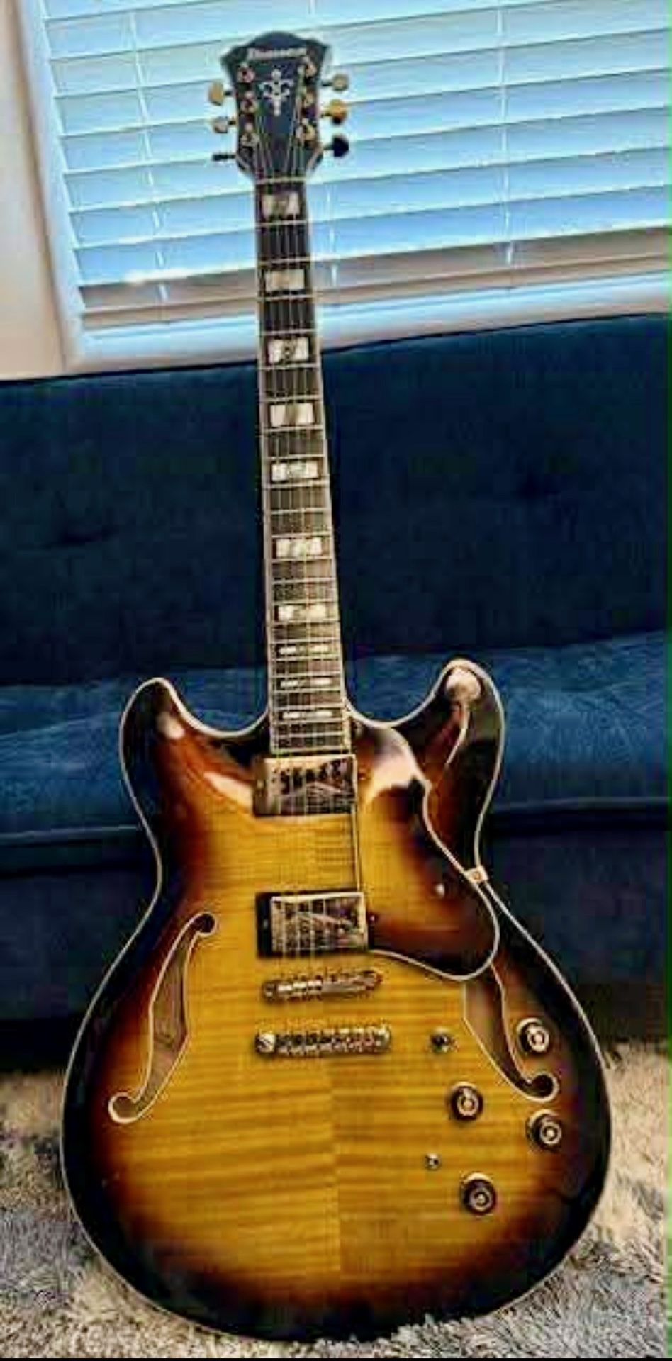 A thinline archtop with a flamed-maple top and dual humbuckers. Ibanez Artstar AS153 Semi-Hollow Electric Guitar answers to the needs of the working professional player. Crafted from specially selected tone woods, this guitar features a bone nut, ebony fingerboard, hand-rolled frets and Ibanez's famous Super 58 pickups-capable of tone magic for any style "rock blues jazz country" all the way to "rock dirty." If you're aiming high, Ibanez has an ARTSTAR is for you! Antique Yellow Sunburst finish Artstar AS set-in neck Flamed Maple top/back/sides Medium Jumbo frets Bound Ebony fretboard Bone nut Pearl/ Abalone block inlay ART1 bridge Super 58 Custom neck pu Super 58 Custom bridge pu Tri sound switch for neck pu Hardshell case included CASH ONLY NO LOW BALL OFFERS PLEASE!