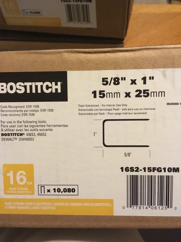 I have 3 Boxes bostitch staples,one box is 10,080 staple x 3 Boxes =30,240 staples.16ga. 1” wide,5/8 long.$ 100.00 for all 3. Price is firm!!!