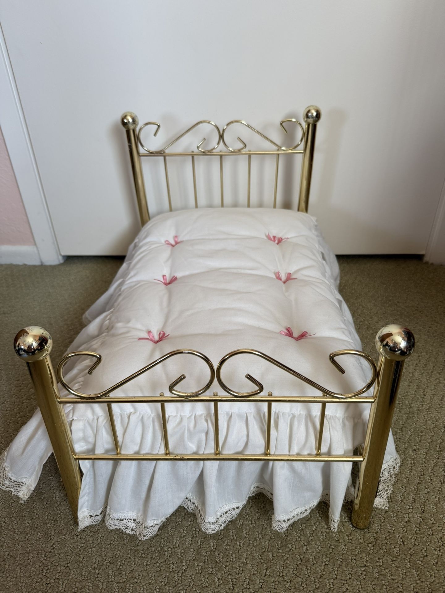 Samantha’s brass bed. Bed spread ragged Pleasant Company, the mattress is AG. The head corners of brass bed has flaws, please see last pic for details. Come with everything pictured. Bed Frame Three-piece brass bed frame. Headboard and footboard pieces are identical save their height; both have two thick bedposts topped with molded spherical knobs, spaced apart by two narrow horizontal brass bars. Between these are five vertical evenly spaced narrow brass bars; these are longer for the headboard than the footboard. The upper horizontal bar is topped with two brass curlicues that mirror each other, forming a shape at the center resembling the top of a heart. The third piece, also of narrow brass bars, is the mattress supporter, which slots into small tubes attached to the headboard and the footboard. This allows for easy assembly and disassembly of the bed. Mattress Cotton tufted mattress. Cream color. Bedspread White tufted bedspread. Gathered, lace trimmed ruffles along both long sides and one short side (the latter is to be slotted through a gap in the footboard). Lining of bedspread is same cream color as mattress, ruffles are unlined. Small rosette bows of narrow pink ribbon at each tufting.