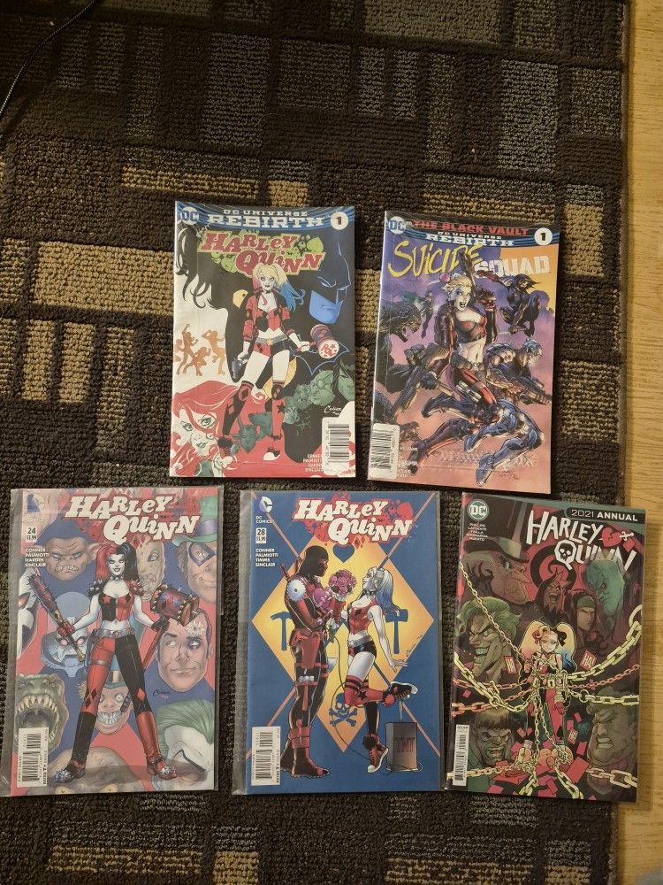 Harley Quinn comic collection. Issue 24 Mar 2016(bagged), issue 28 Jul 2016(bagged), 2021 annual Harley Quinn(bagged), the black vault dc universe rebirth suicide squad 3 comic collection(cellophane wrapped), and DC universe rebirth Harley Quinn 3 pack(cellophane wrapped).