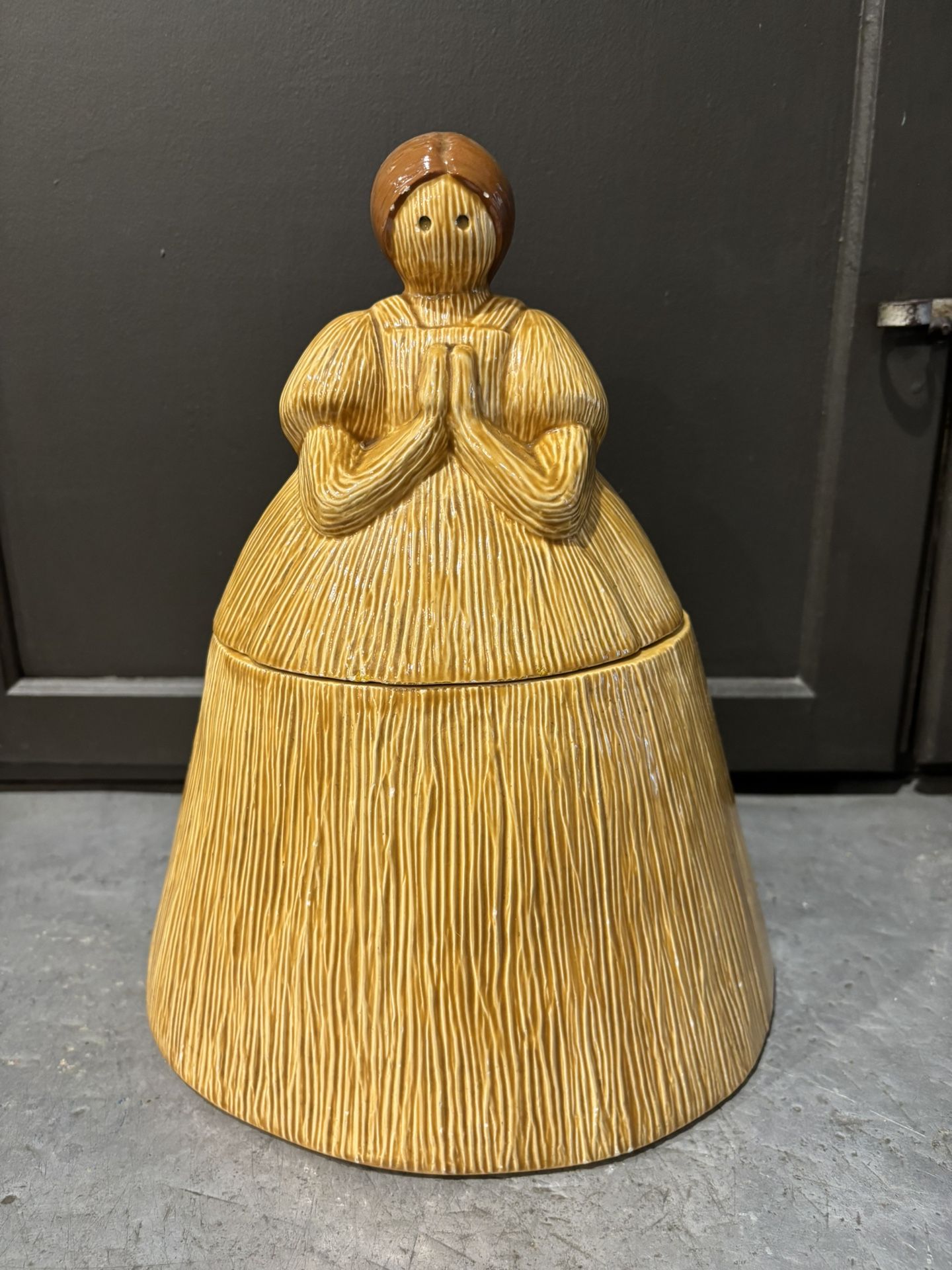 Vintage circa 1970 LeDolls praying Cornhusk Girl cookie jar. In super condition with minimal wear. Measures 12 in H x 10 in W approximately. I’m in the sugarland Missouri city area.