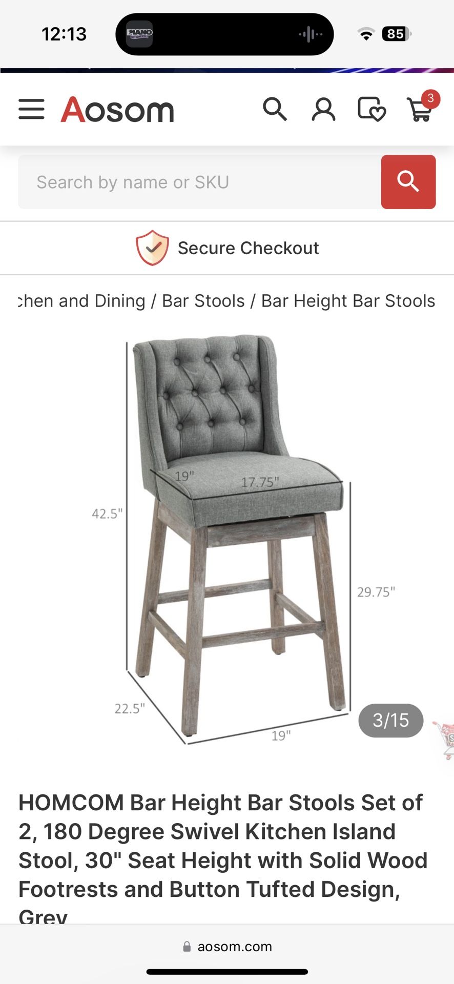 *Brand New In Box!!* Tall bar stools. Gray button tufted fabric design with solid wood legs. 180• swivel. These are beautiful chairs but unfortunately we went in a different direction with the counter height and these are not tall enough for our needs. Was going to send them back but return shipping is too expensive. A total of 6 chairs. Willing to sell in pairs if you don’t want all 6.