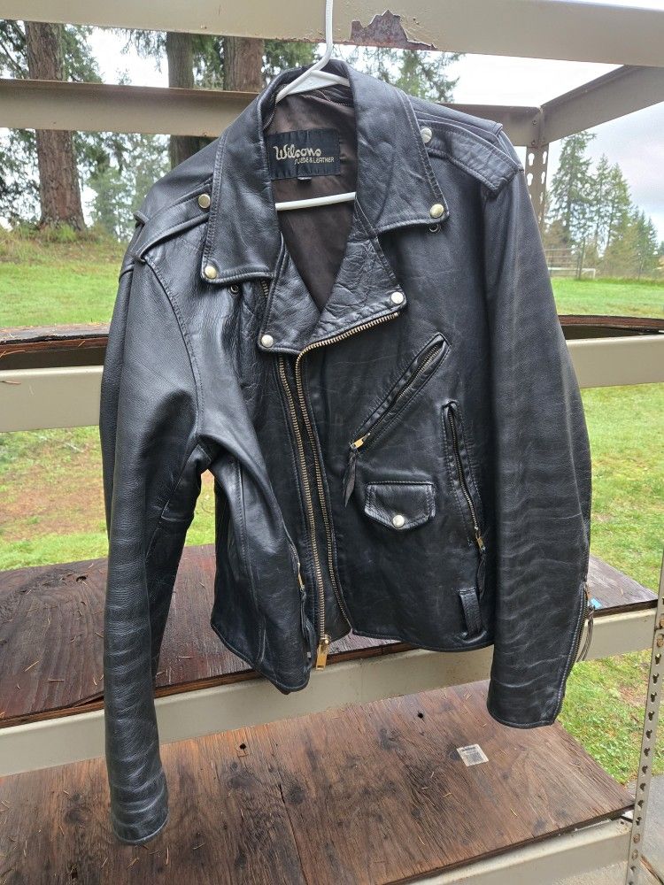 Size 46, vintage 1980's before the quality went down. All zips and snaps work perfectly, no rips, some small spots in the lining could use some sewing but nothing serious. Belt that came with the jacket included. Sleeves-27." Length-26" Pit to pit-22" Cash only, im in tumwater.