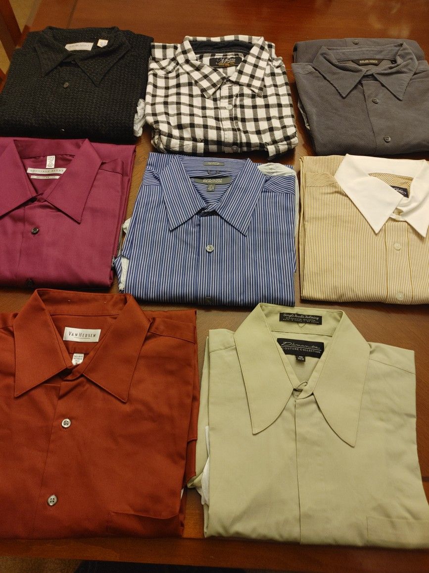 All 8 men's namebrand dress shirts size large 16 1/2 neck.Brands are : Mecca,Kenneth Cole,Murano,and Geoffrey Beene.3 dress shirts on top row left to right corduroy like material,2nd flannel,last like corduroy material keeps you warm without jacket on some days.