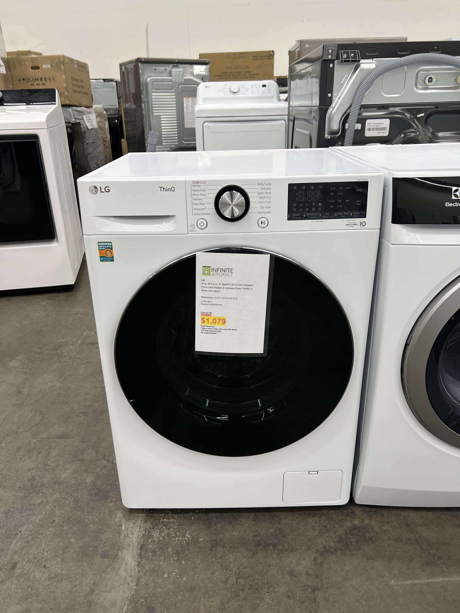 LG 24 in. W 2.4 cu.ft. SMART All-in-One Compact Front Load Washer & Ventless Dryer Combo in White with Steam Dimensions: 33.5 H x 24 W x 22.25 D OPEN BOX Model:# WM3555HWA Delivery available 1 year warranty Come visit us! Open 7 days Hablamos espanol Reg price $1,799 Sale price $1,079 Take it home today only $39 down No cred1t needed