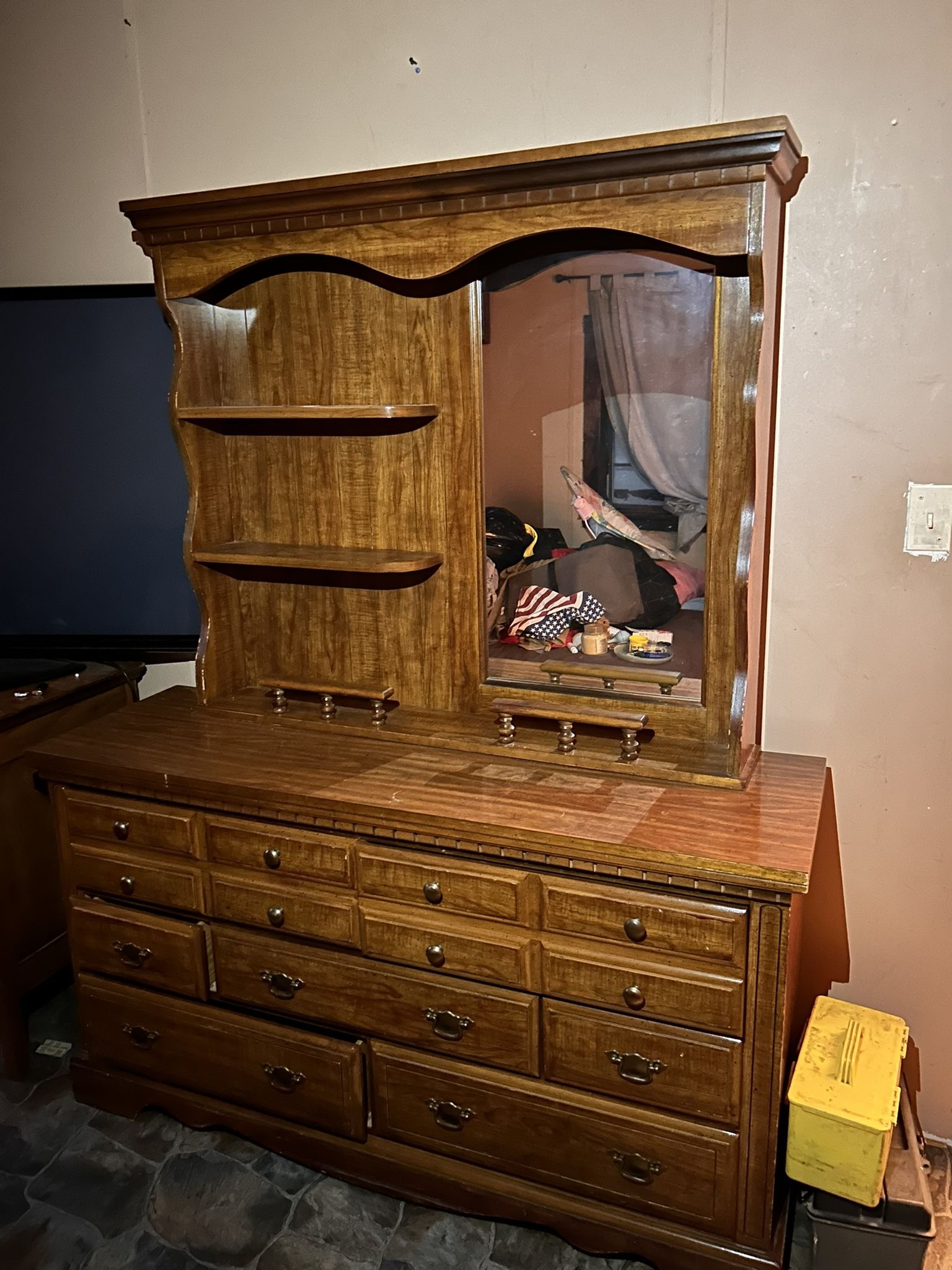 This is a passed down dresser from my husbands grandma. Was used for a few months. We are moving. It’s is in mint condition, mirror is removal. $250 if we drop off. $200 if Pick up.