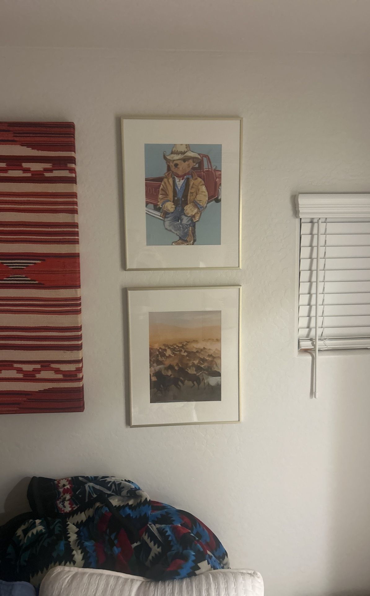 Three picture frame gold frame set with glass top photos and matting included pick up only