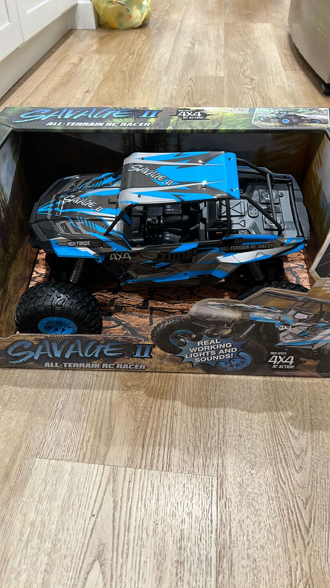 Brand New - still in box Savage II All-Terrain RC Racer Black/Blue High Speed 4x4 RC Action Heavy Duty Suspension Shocks for Off-Road Racing Real Rubber Tires Real Working Lights & Sounds High Torque Age 8+