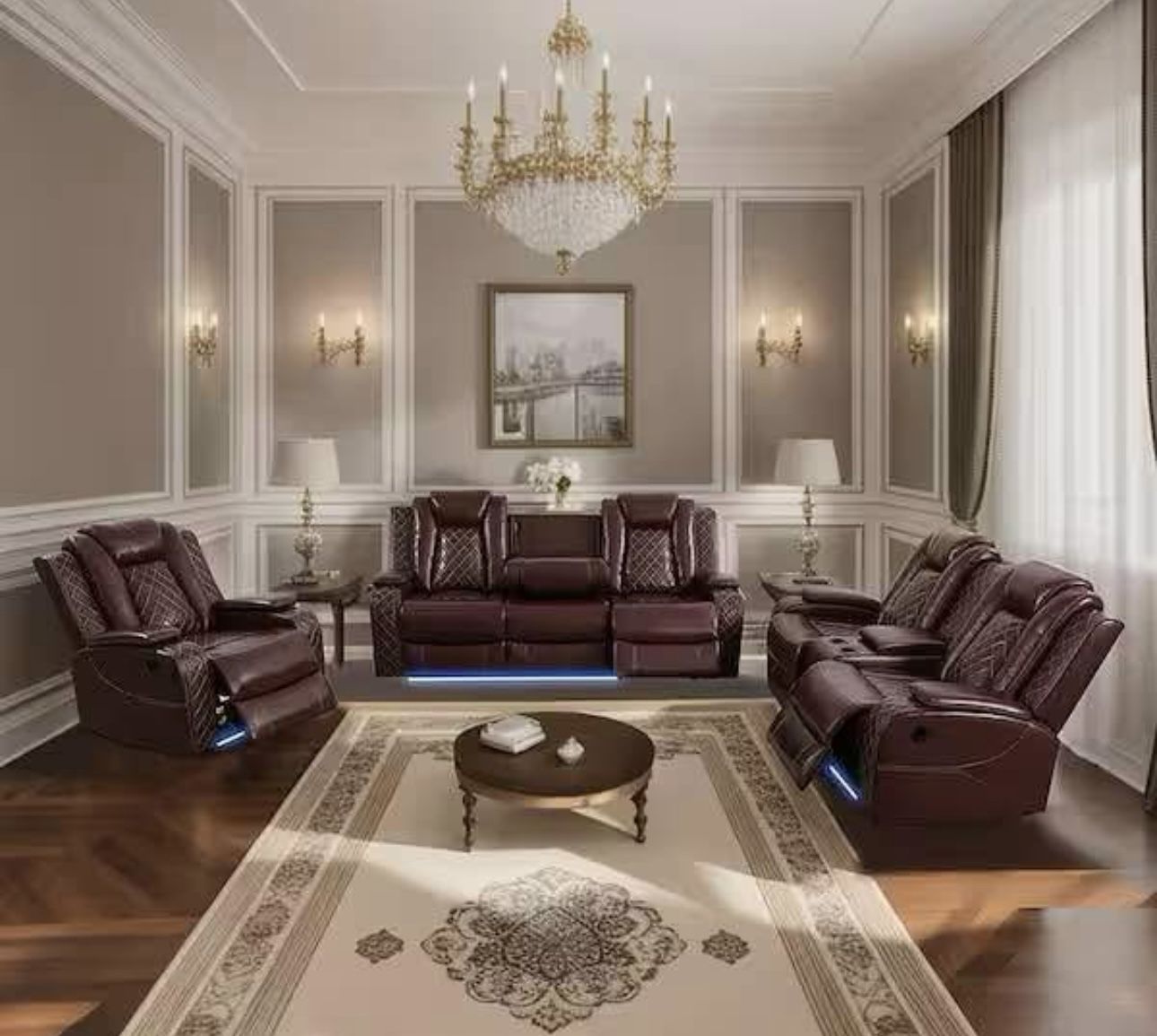 Power Electric Brown Leather Fully Reclining Three Piece Couch Set