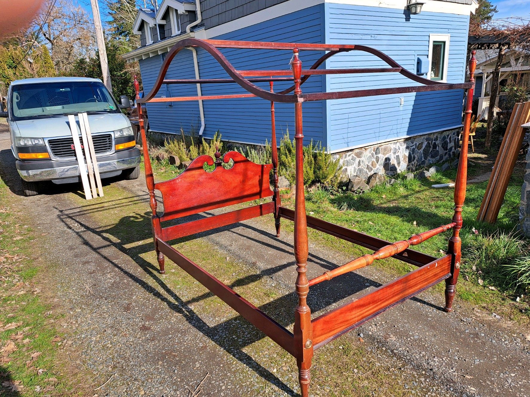 Made of mahogany or Honduran hardboard together with maple. Disassembles for transport and re-assembly in home. Will instruct regarding re-assembly; or will deliver and reassemble prepaid item between Chehalis and Everett.