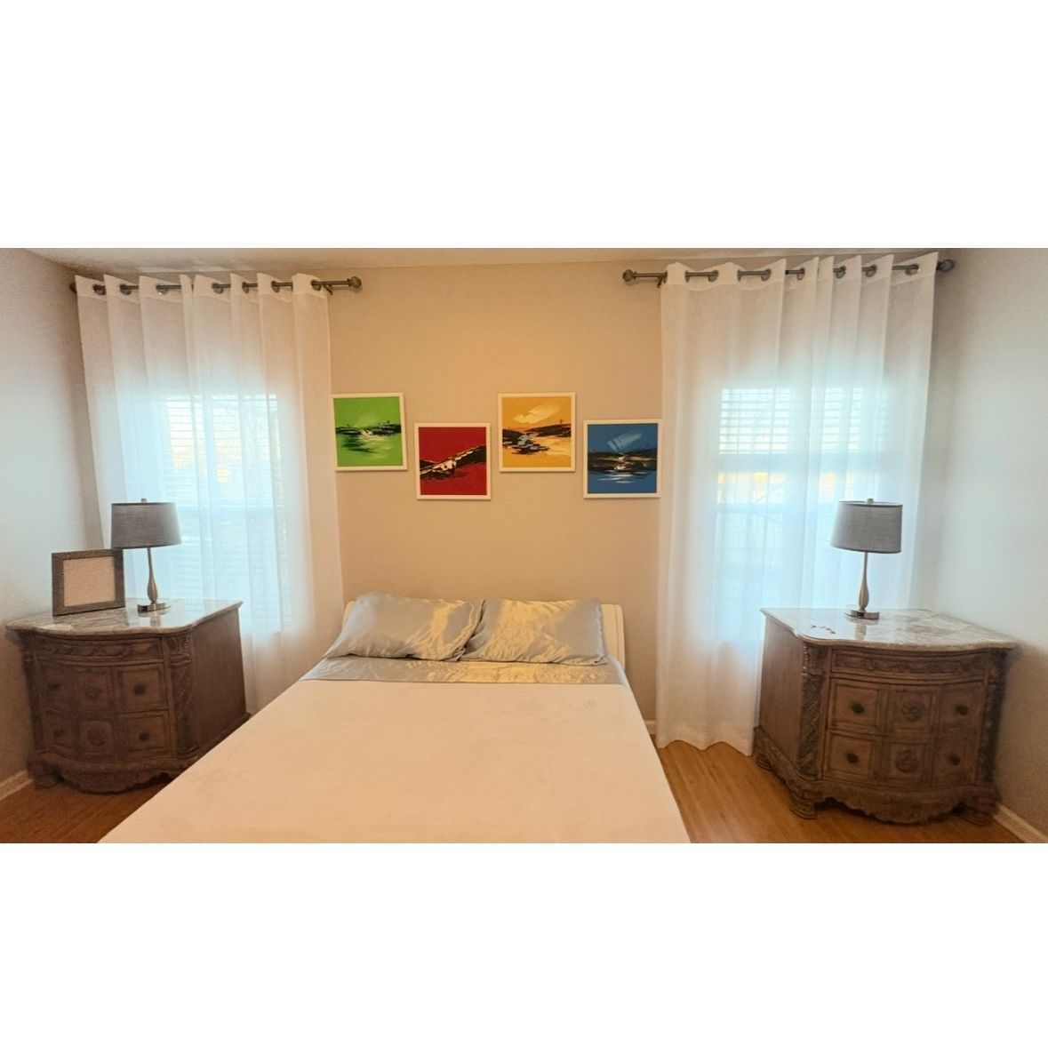 36” L 19.5” W 34.5” H Price per each. From no smoke, no pets home. Located in World Golf Village area. Solid wood and marble top. Heavy. Top drawer has a velvet lining. It has a few spots where fibers from a moving blanket get stick to the wood and GooGone or Murphy oil needs to be used to remove it. No one noticing it unless it can be pointed to.