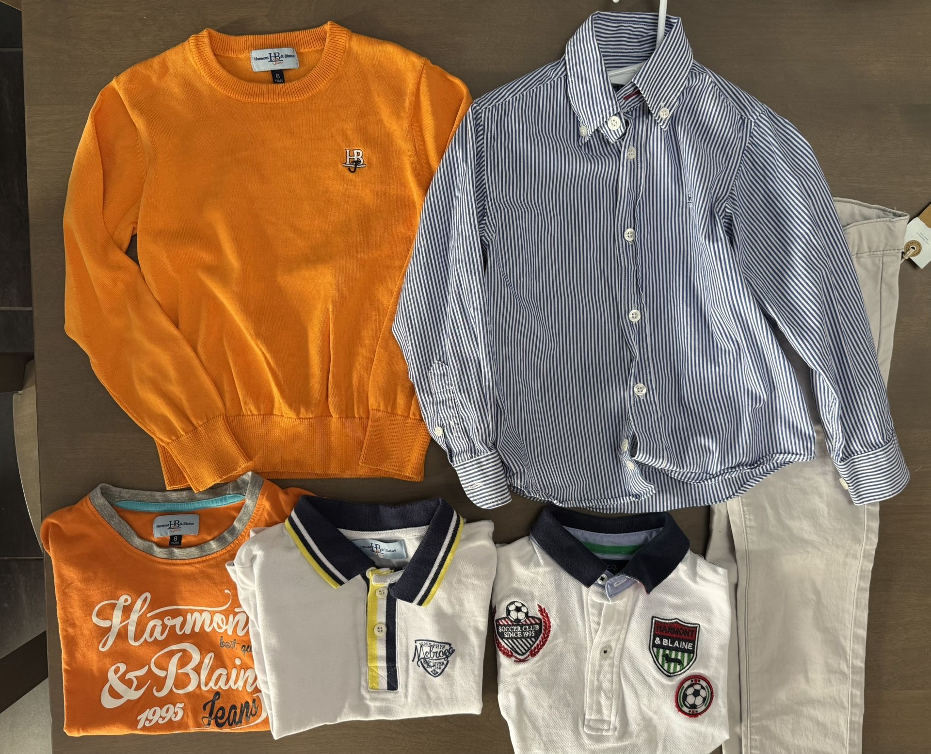 All like brand new condition Designer Harmont and Blaine Sizes: Sweater 6 Short sleeve shirt 8 Blue/yellow collar polo 4/5 Blue/red polo 6 Striped button down 4 Pants (brand new with tags)