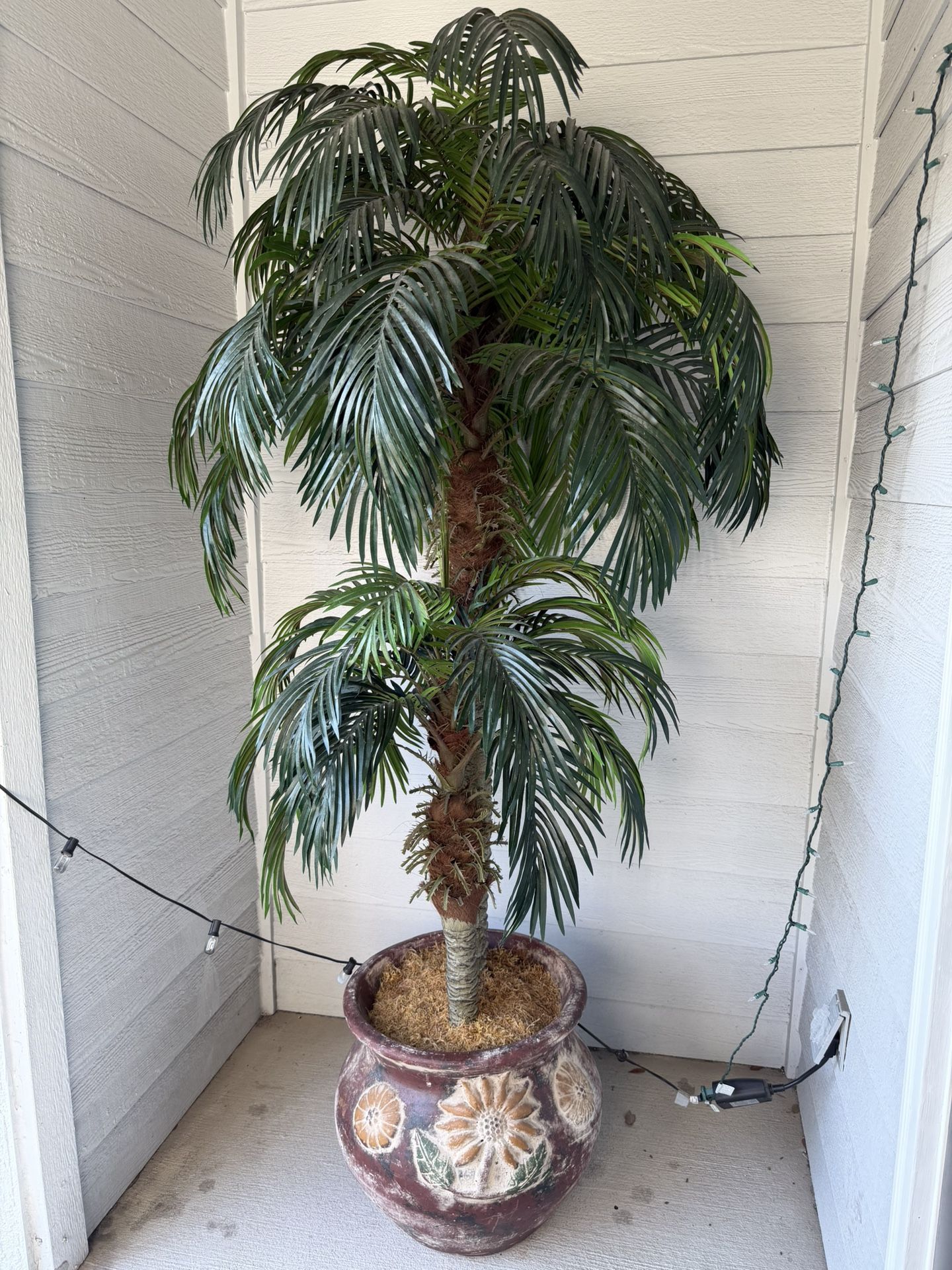 Realistic two trunk artificial palm tree about 6.5 feet tall with beautiful ceramic pot. Perfect for your Florida home. In excellent condition! Can be used for indoor or outdoor use.
