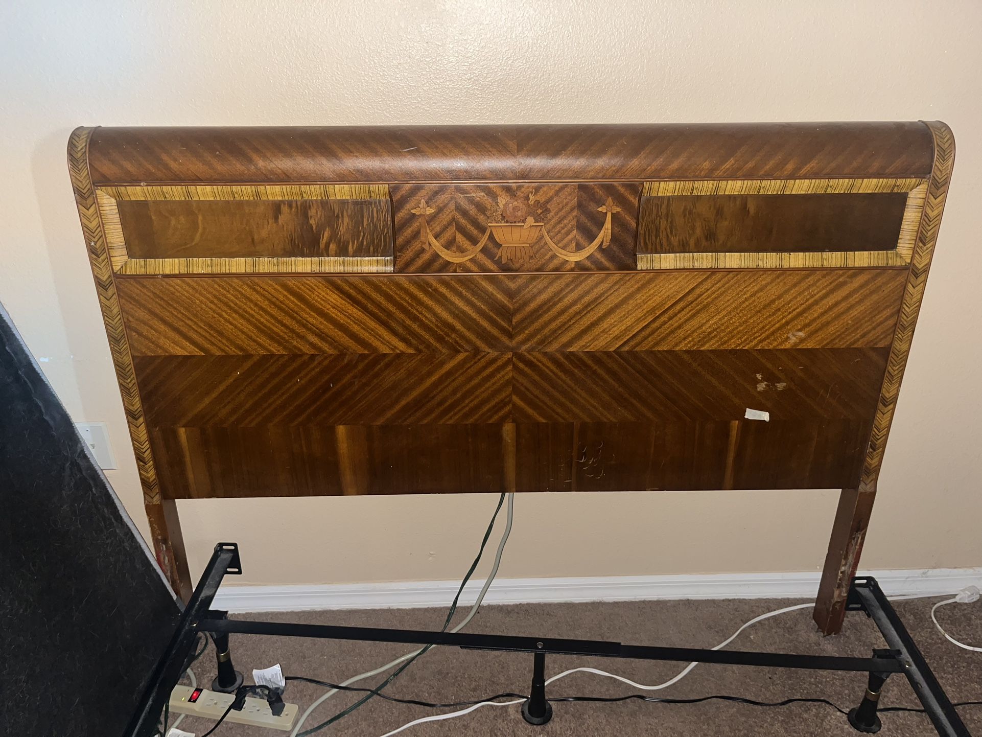 It’s a sturdy massive headboard 42” tall by 56” long wood is 3 inches thick at its thickest and 2 inches at its thinnest I’m not sure how old it is (I’ve had it for at least 20 years), but I suspect it’s vintage or antique. PICK UP ONLY IN KISSIMMEE NEAR 429 NEED GONE BY SUNDAY
