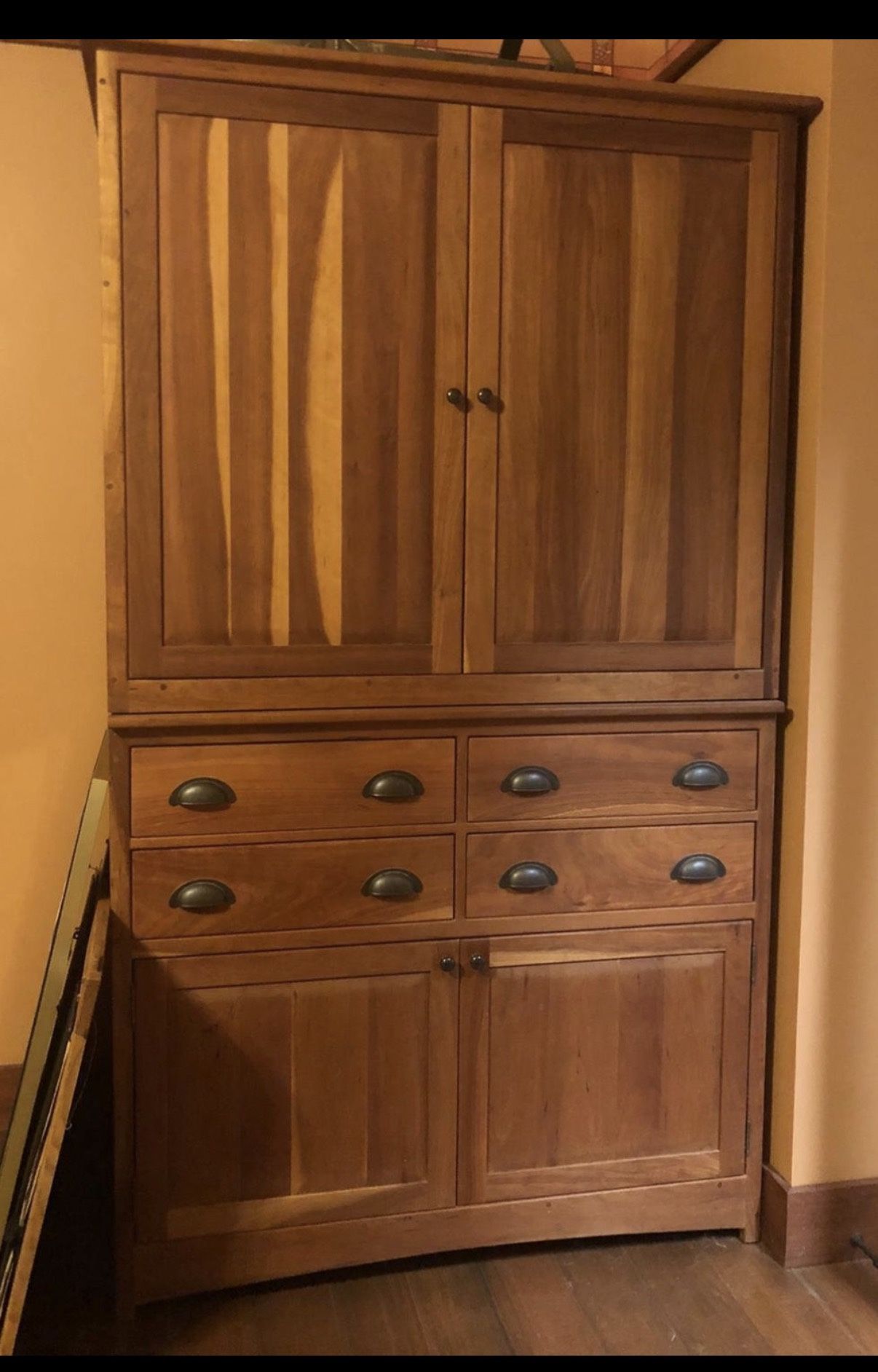Handcrafted and handrubbed by Indiana Amish craftsmen, this two-piece solid wood chest is made from locally harvested cherry. All doors have black knob handles and drawers have black cup handles. Top piece features large cabinet doors that retract into the sides of the piece for display or easy access. Lots of storage space for objects large and small! It is a lovely piece!! I wish we had room to keep it. Dimensions: Top: 47" W x 40.25" H x 27" D Bottom: 45" W x 39.25" H x 27" D Priced to sell. No low ball offers please. The price reflects that you may need to rent a truck and hire help to move it. Also selling the pieces separately, asking $400 for the bottom or $300 for the top. Why so much? Because I don’t want to deal with selling two items and they are still a bargain at that price 😊 It is heavy and you need at least two able-bodied people to load. I may be able to transport both pieces locally, if you come to load, for $100-200, depending on distance. U-Haul is cheaper. Please message me if you have any other questions.